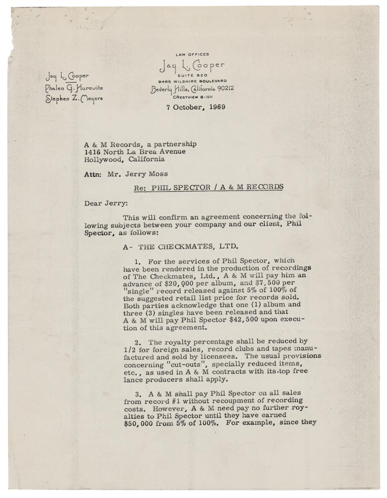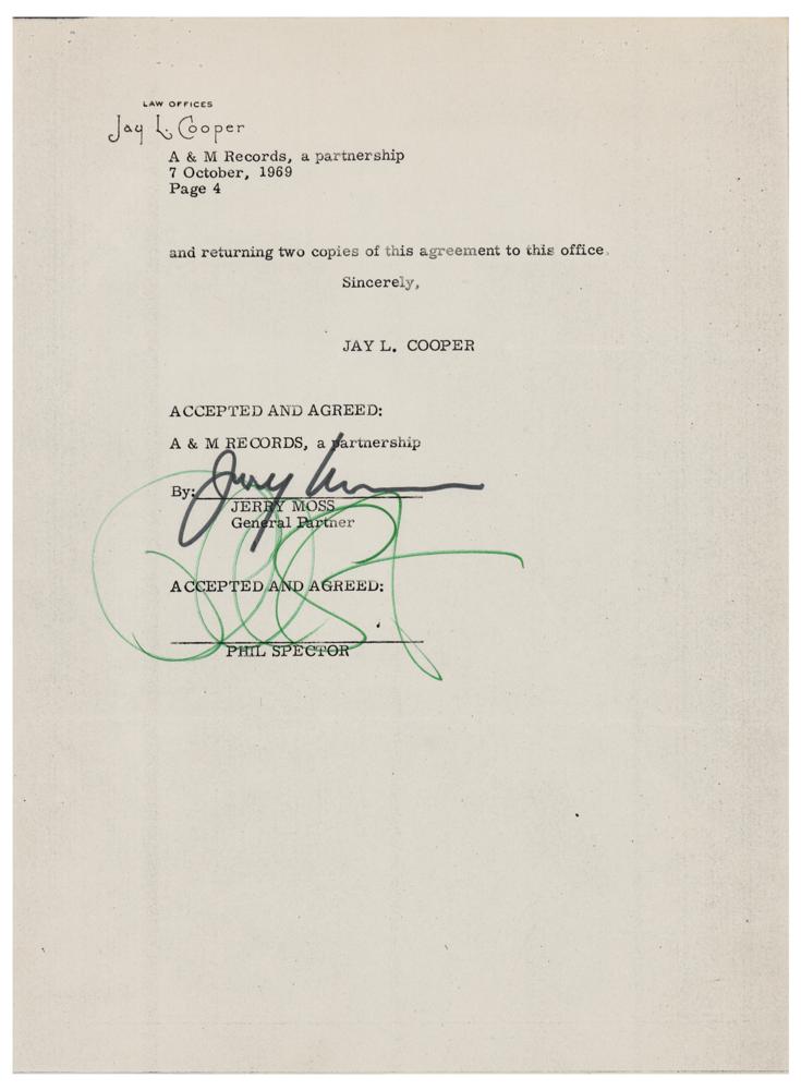 DS, four pages, 8.5 x 11, October 7, 1969. Agreement between Phil Spector and A&M Records, concerning records produced for The Checkmates and The Ronettes. In part: "For the services of Phil Spector, which have been rendered in the production of recordings of The Checkmates, Ltd., the A&M will pay him an advance of $20,000 per album, and $7,500 per 'single' record released?Phil Spector shall receive credit on all labels, liners, covers and advertising?A&M will give to Phil Spector as of January 1, 1970, the ownership of all masters produced by Phil Spector of The Ronettes for A&M." Signed at the conclusion in felt tip by Phil Spector and Jerry Moss. In fine condition, with light creasing and handling wear.