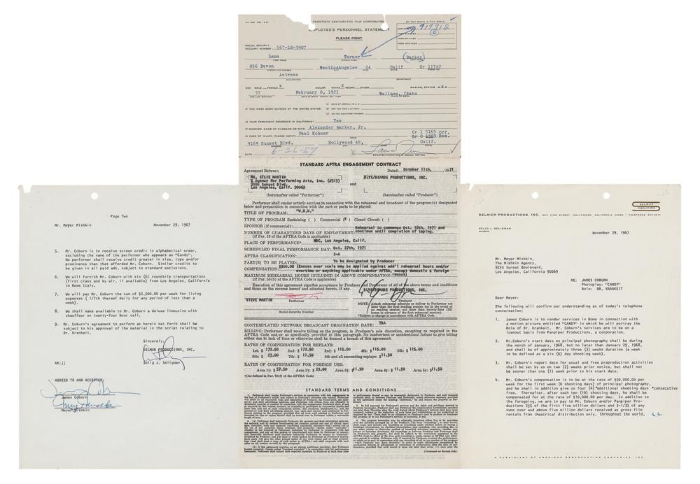 Three documents signed by actors: a 1957 employee's personnel statement for 20th Century Fox, signed by Lana Turner; a 1967 Selmur Productions document employing James Coburn to appear as Dr. Krankeit in Candy, signed by Coburn; and a 1971 document for Steve Martin to appear on W.O.W., signed by Martin. In very good to fine condition, with some paper loss to Turner.