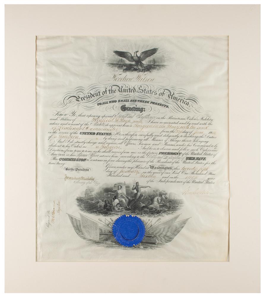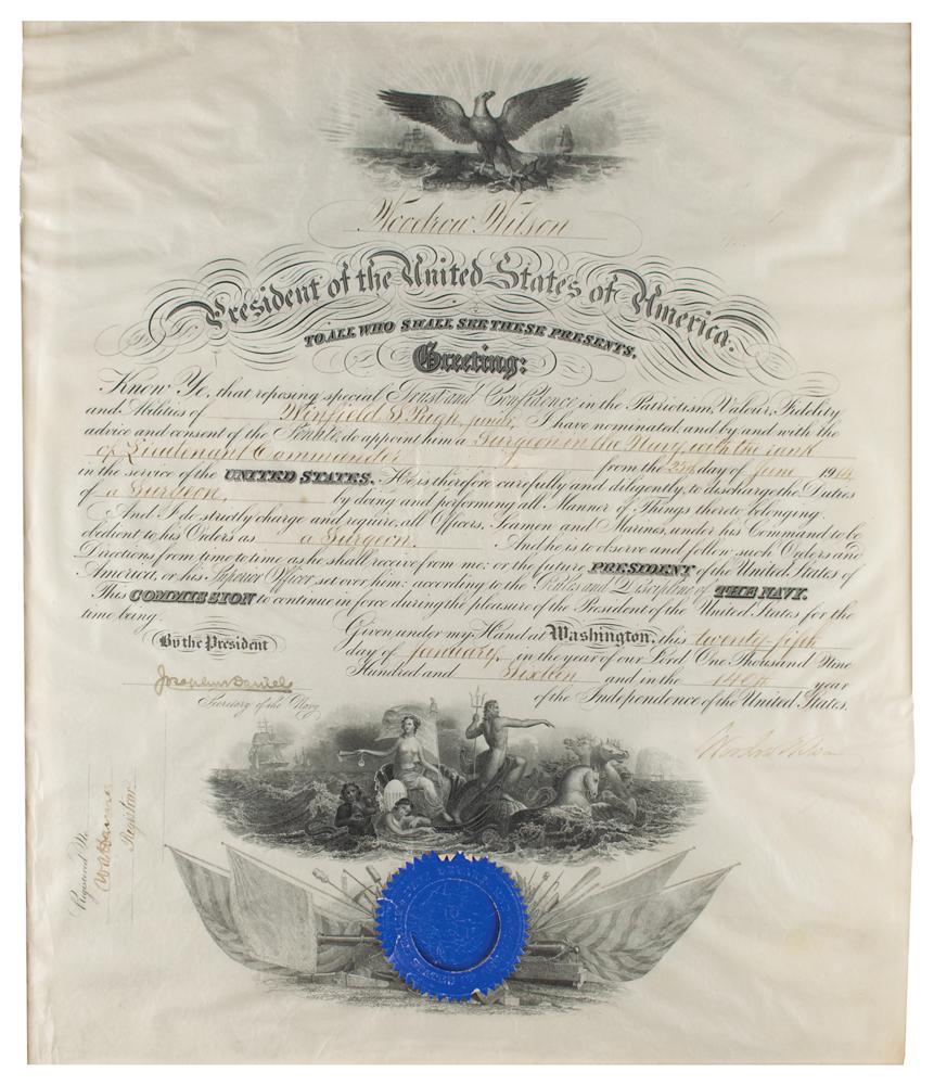 World War I-dated partly-printed vellum DS, one page, 15.5 x 19.25, January 25, 1916. President Wilson appoints Winfield S. Pugh, Jr., as a "Surgeon in the Navy, with the rank of Lieutenant Commander." Signed at the conclusion by Woodrow Wilson, and countersigned by Secretary of the Navy Josephus Daniels. The blue Navy Department seal remains affixed to the lower vignette. Matted to an overall size of 20.5 x 23. In very good to fine condition, with overall wrinkling and rippling, the signature several shades light, and the blue seal torn and lifting from document.