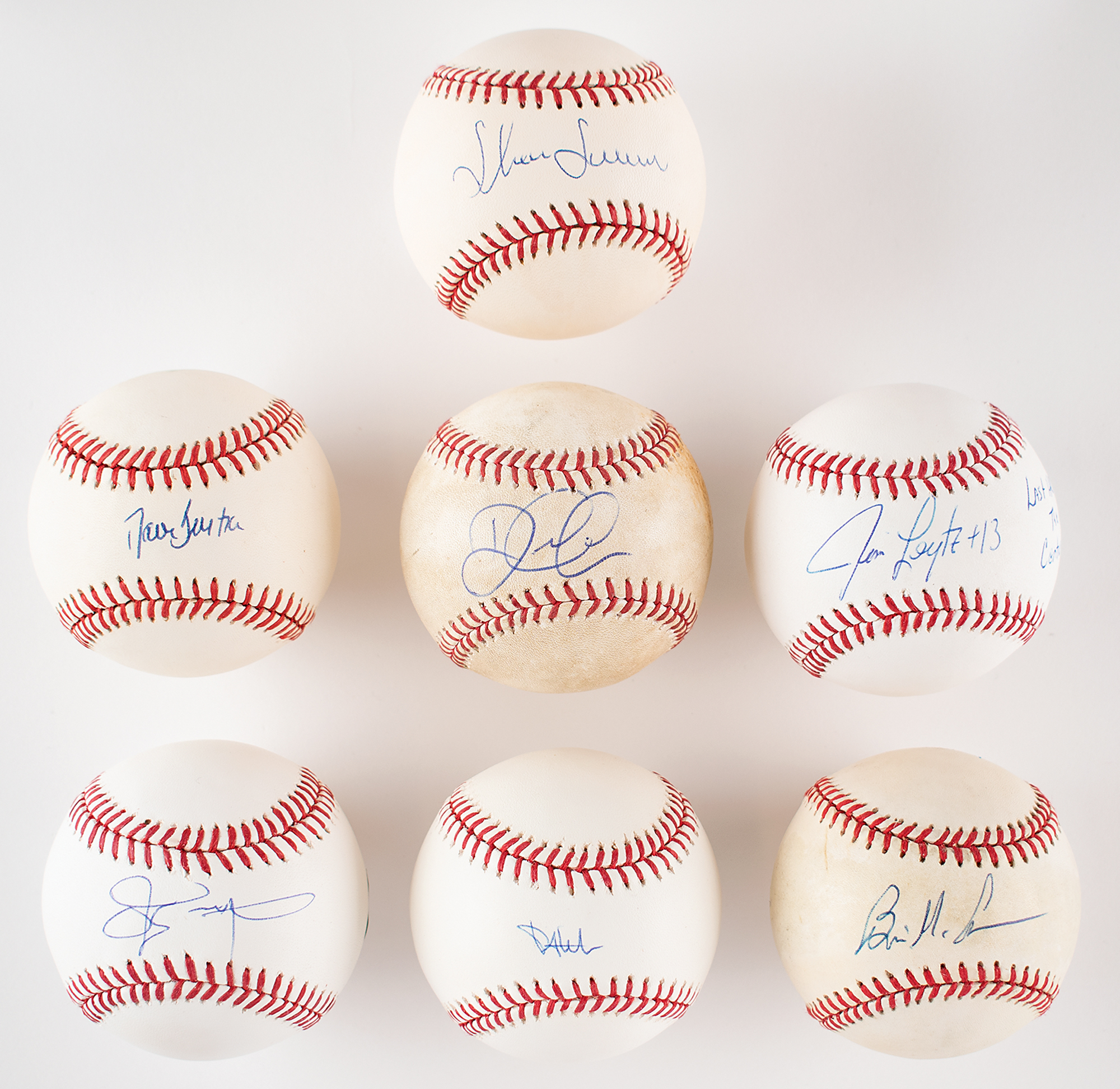 Seven official Rawlings Major League (Selig and Manfred) baseballs, each signed on the sweet spot in ballpoint by a modern-day New York Yankees star. Includes: Jason Giambi, Phil Hughes, Shane Spencer, Didi Gregorious (game-used 8/25/2015, with MLB and Steiner holograms), Brian McCann, David Justice, and Jim Leyritz ("Last HR of the Century, 10/27/99"). In overall fine condition, with Steiner or MLB holograms affixed to most.