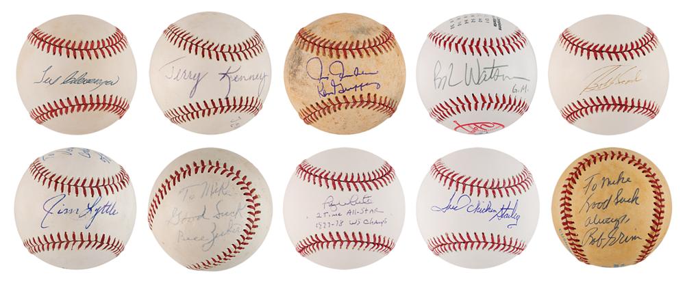 Ten official Spalding and Rawlings baseballs, each signed in ballpoint by a New York Yankees player from the 1940s through the 1980s. Includes: Tex Clevenger, Bill Zuber (ins), Jim Lyttle (ins), Jerry Kenney, Fred 'Chicken' Stanley, Bob Grim (ins), Chris Chambliss and Ken Griffey, Bobby Bonds, Bob Watson, and Roy White. In very good to fine condition, with some scattered staining, and overall soiling to the Chambliss/Griffey ball (possibly game used).