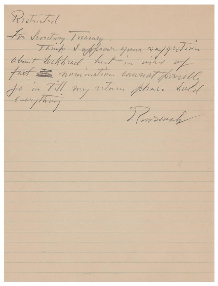 Rare ALS in pencil as president, signed “Roosevelt,” one page, 8 x 10.5, no date. Handwritten memo to Secretary of the Treasury Henry Morgenthau, Jr., marked "Restricted," in full: "Think I approve your suggestion about Lockheed but in view of fact nomination cannot possibly go in till my return please hold everything." In fine condition. Consignor notes that Roosevelt wrote this while aboard the famous cruiser USS Houston, which he sailed on several times during his presidency. It is unusual for such a message not to have been retained in the presidential archives. Its plain nature—in pencil on a lined sheet—is compensated for by its rarity as such an important directive.