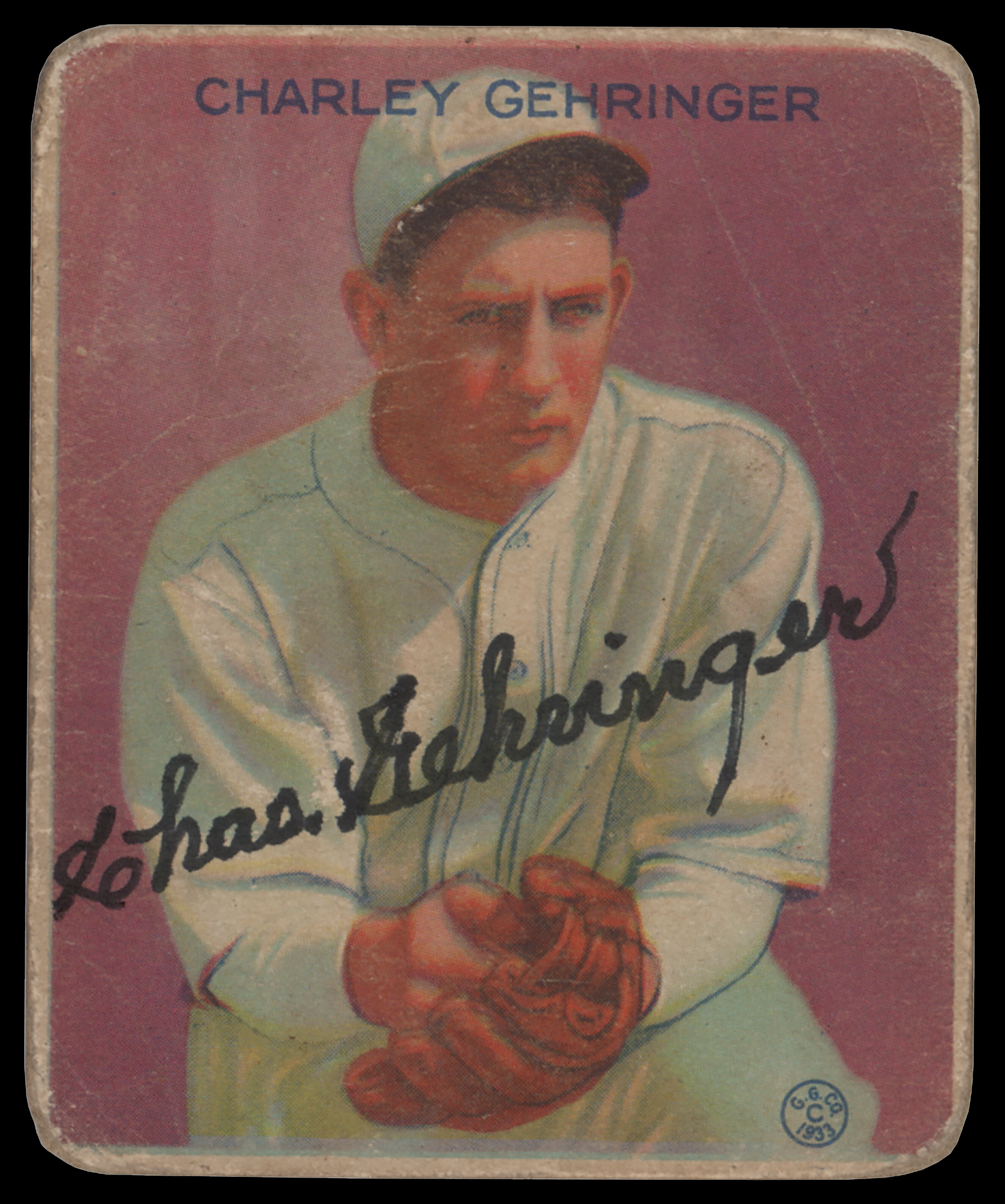 Attractive 1933 Goudey #222 Charley Gehringer baseball card, neatly signed in black felt tip by the Hall of Fame infielder, "Chas. Gehringer." In very good to fine condition, with light creases and rounded corners.