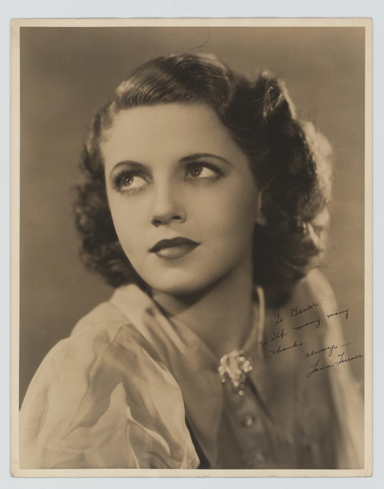 Excellent vintage matte-finish 11 x 14 photo of Turner by Scotty Welbourne, signed and inscribed in fountain pen to Barron Polan (assistant to The Wizard of Oz producer Mervyn LeRoy), "To Baron: With many, many thanks. Always—Lana Turner.” Reverse bears Welbourne's credit stamp. In very fine condition, with a tiny crease to the lower right corner tip.