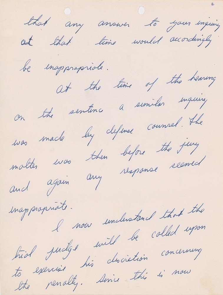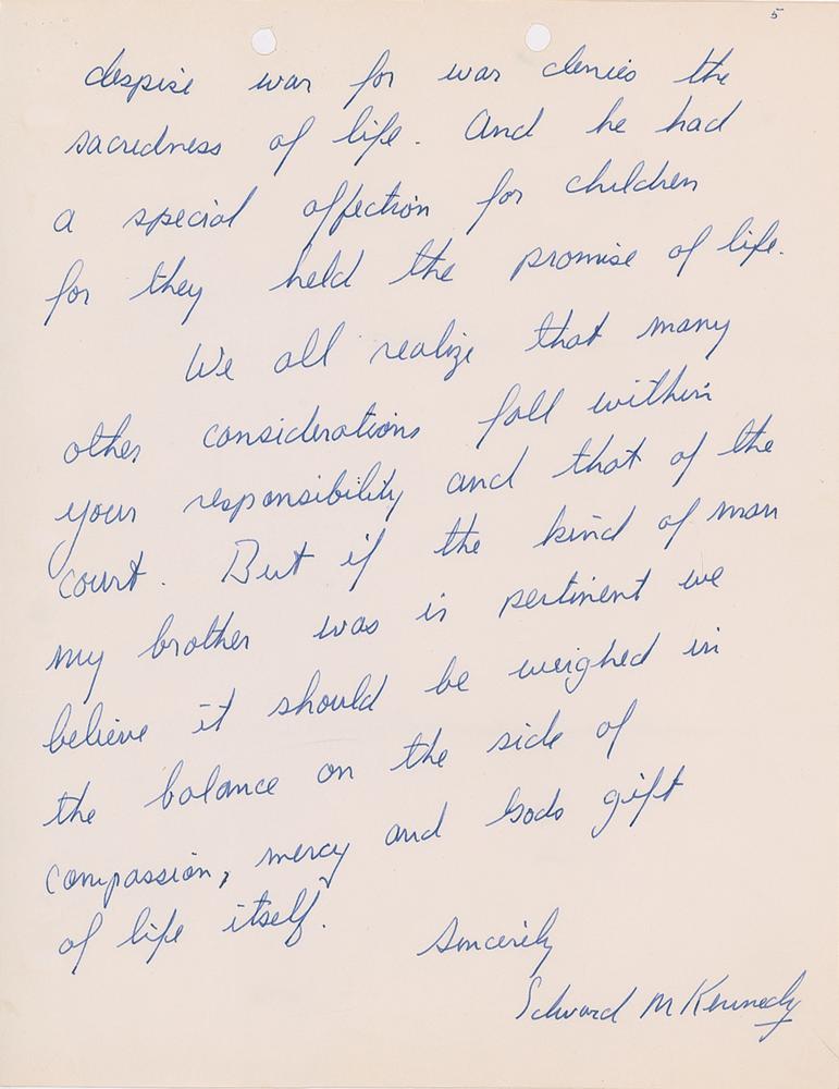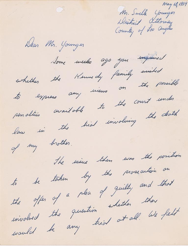After finding Sirhan Sirhan guilty of murder in the first degree, District Attorney Evelle J. Younger asked the Kennedy family if they had any comments or recommendations relative to the penalty in this case, which was death in the electric chair. At this time in California a judge could if he wanted to as a form of clemency reduce the punishment of death to life imprisonment. The following 5-page Ted Kennedy letter to the court represented the Kennedy family position in regards to the death penalty Sirhan Sirhan faced. It wasn't until 1972 that the death sentence was eliminated as punishment in California for first degree murder and replaced by life imprisonment without the chance of parole. This also meant that all prisoners who were on death row at the time and waiting for execution had their sentences converted to life imprisonment which became the case for Sirhan Sirhan.