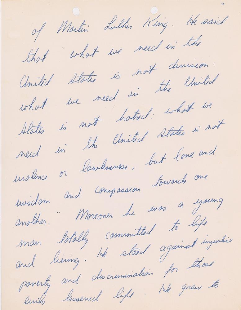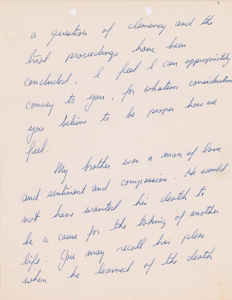 In part: "My brother was a man of love and sentiment and compassion. He would not have wanted his death to be a cause for the taking of another life. You may recall his pleas when he learned of the death of Martin Luther King. He said that 'what we need in the United States is not division. What we need in the United States is not hatred. What we need in the United States is not violence or lawlessness, but love and wisdom and compassion towards one another.' Moreover he was a young man totally committed to life and living. He stood against injustice, poverty, and discrimination for those evils lessened life. He grew to despise war for war denies the sacredness of life. And he had a special affection for children for they held the promise of life. We all realize that many other considerations fall within your responsibility and that of the court. But if the kind of man my brother was is pertinent we believe it should be weighed in the balance on the side of compassion, mercy and God's gift of life itself."