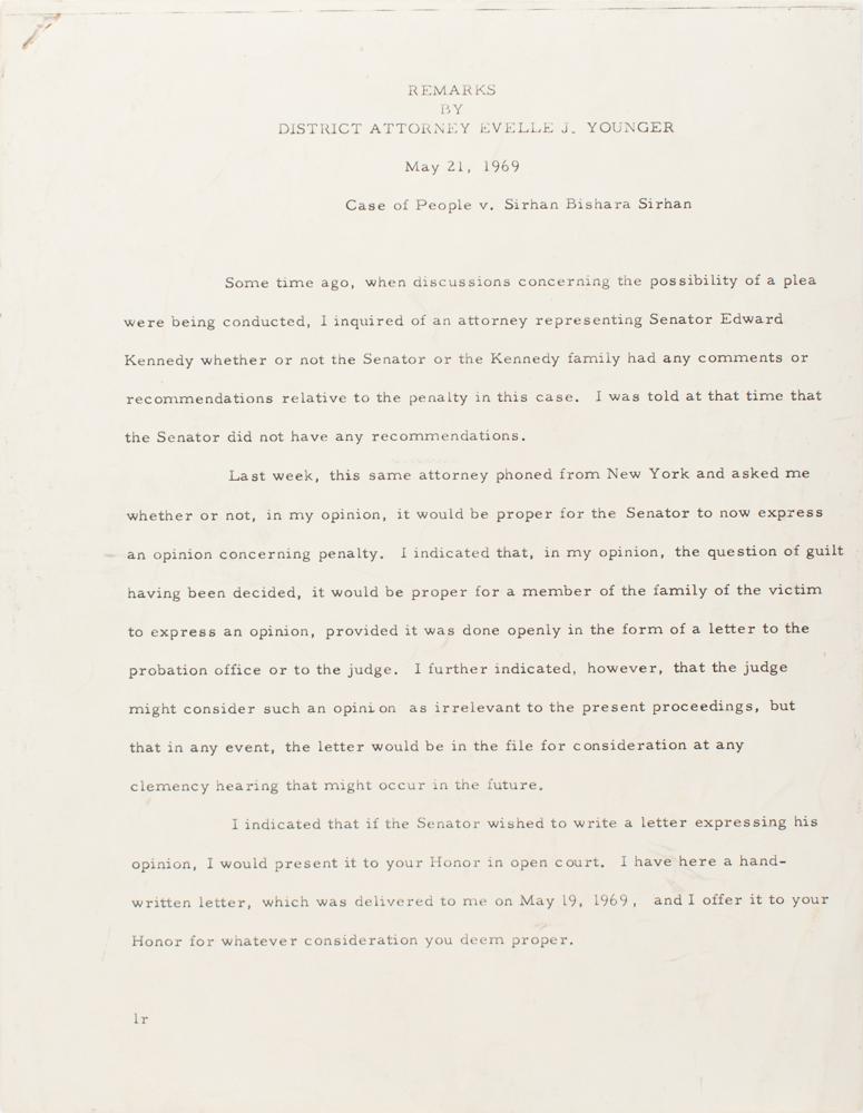 Ted Kennedy 5-page ALS May 18, 1969 to Mr. Evelle Younger District Attorney who prosecuted Sirhan Sirhan for the assassination of Robert F. Kennedy, Remarks by District Attorney Evelle J. Younger May 21, 1969 Case of People v. Sirhan Bishara Sirhan.