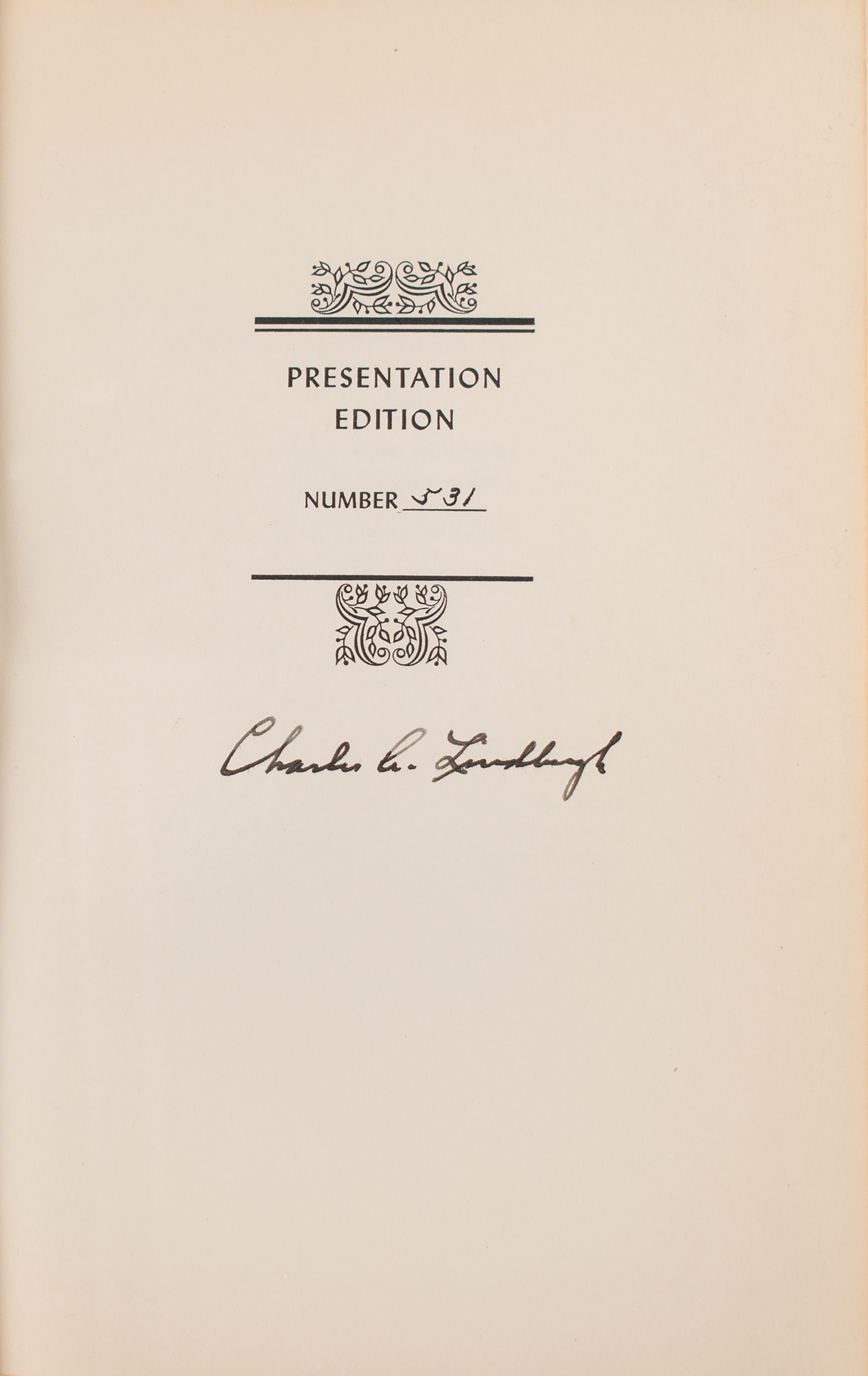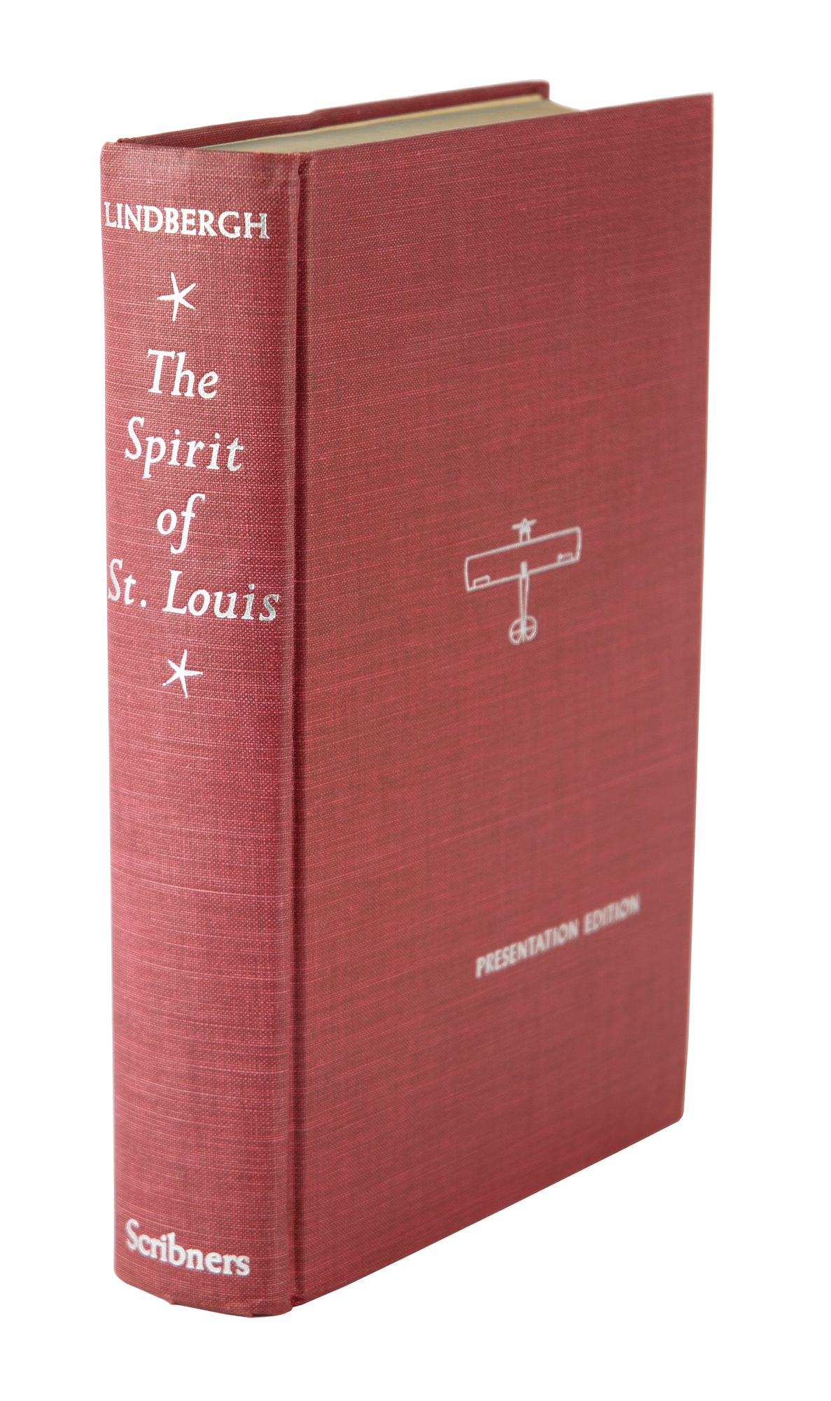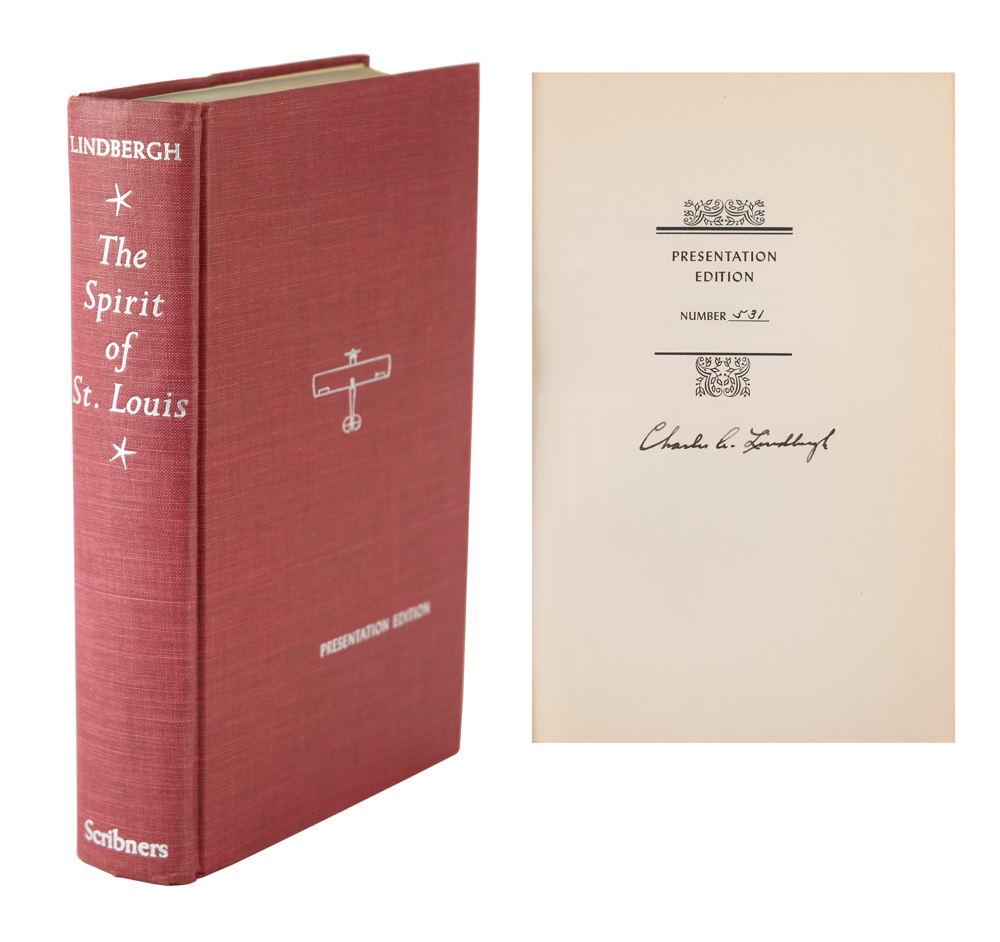Signed book: The Spirit of St. Louis. Limited presentation edition, number 531. NY: Charles Scribner's Sons, 1953. Hardcover with acetate jacket, 5.75 x 8.5, 562 pages. Signed on the colophon in fountain pen, "Charles A. Lindbergh." Autographic condition: fine. Book condition VG/VG, with a bump to the top edge of the rear board and some cracks to the acetate jacket. A sought-after example of this high point of aviation literature.