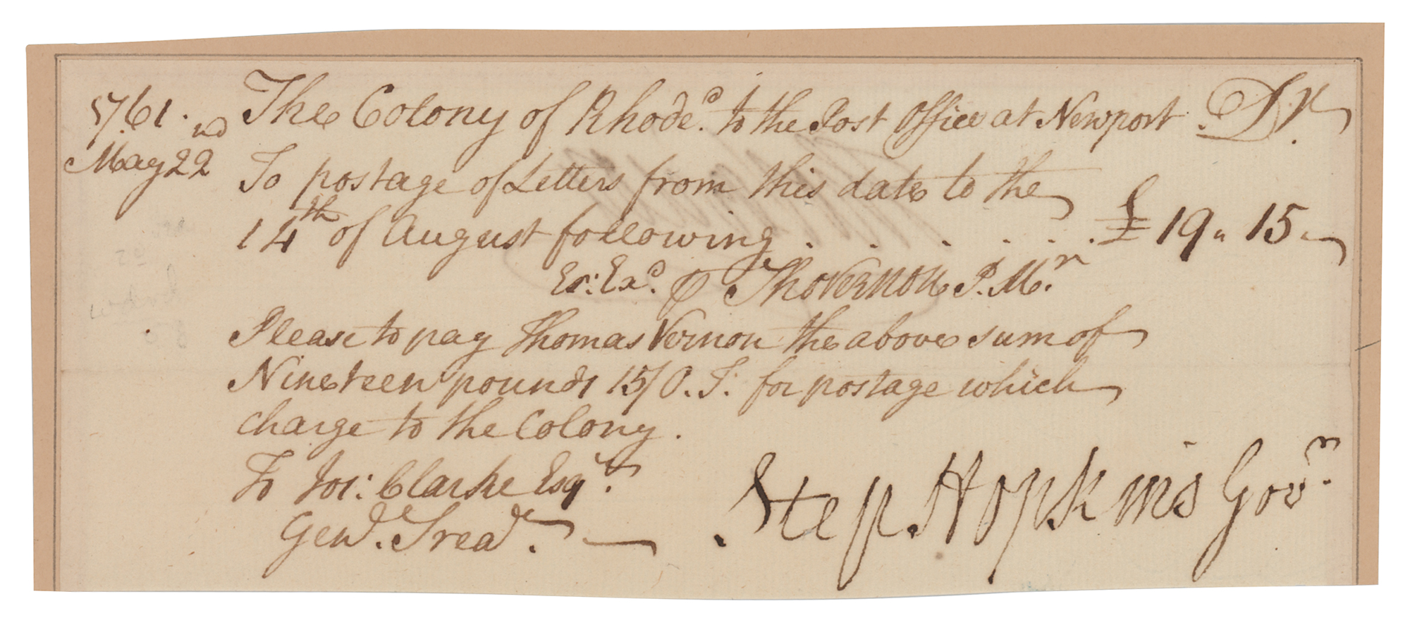 Signer of the Declaration of Independence from Rhode Island (1707-1785) who served as the colony's governor in the 1750s and 1760s. Manuscript DS, signed “Step. Hopkins Gov'r,” one page, 6.25 x 2.5, May 22, 1761. Request to the Post Office at Newport to pay £19.15 to Thomas Vernon "for postage which charge to the Colony." Boldly signed at the bottom by Hopkins as governor of Colony of Rhode Island and Providence Plantations. In fine condition, with a trimmed bottom edge.