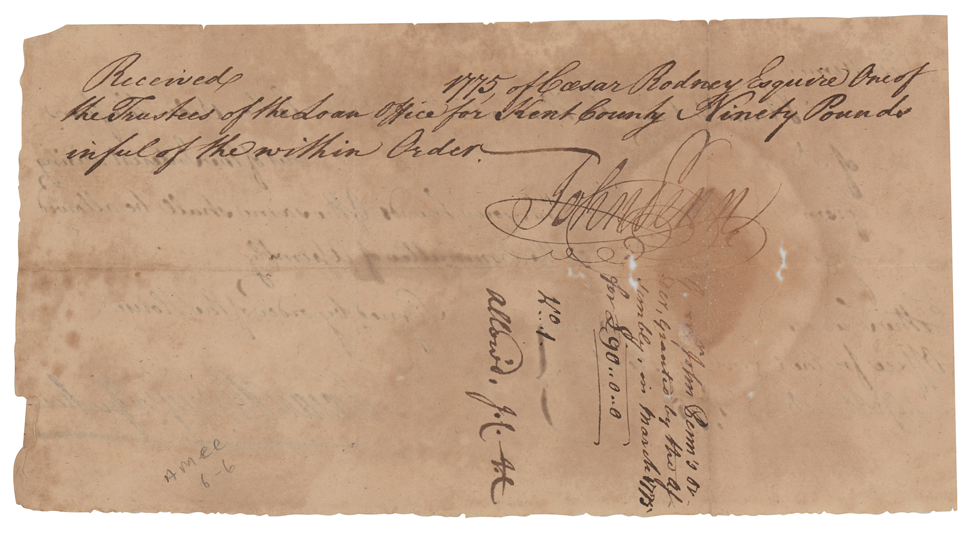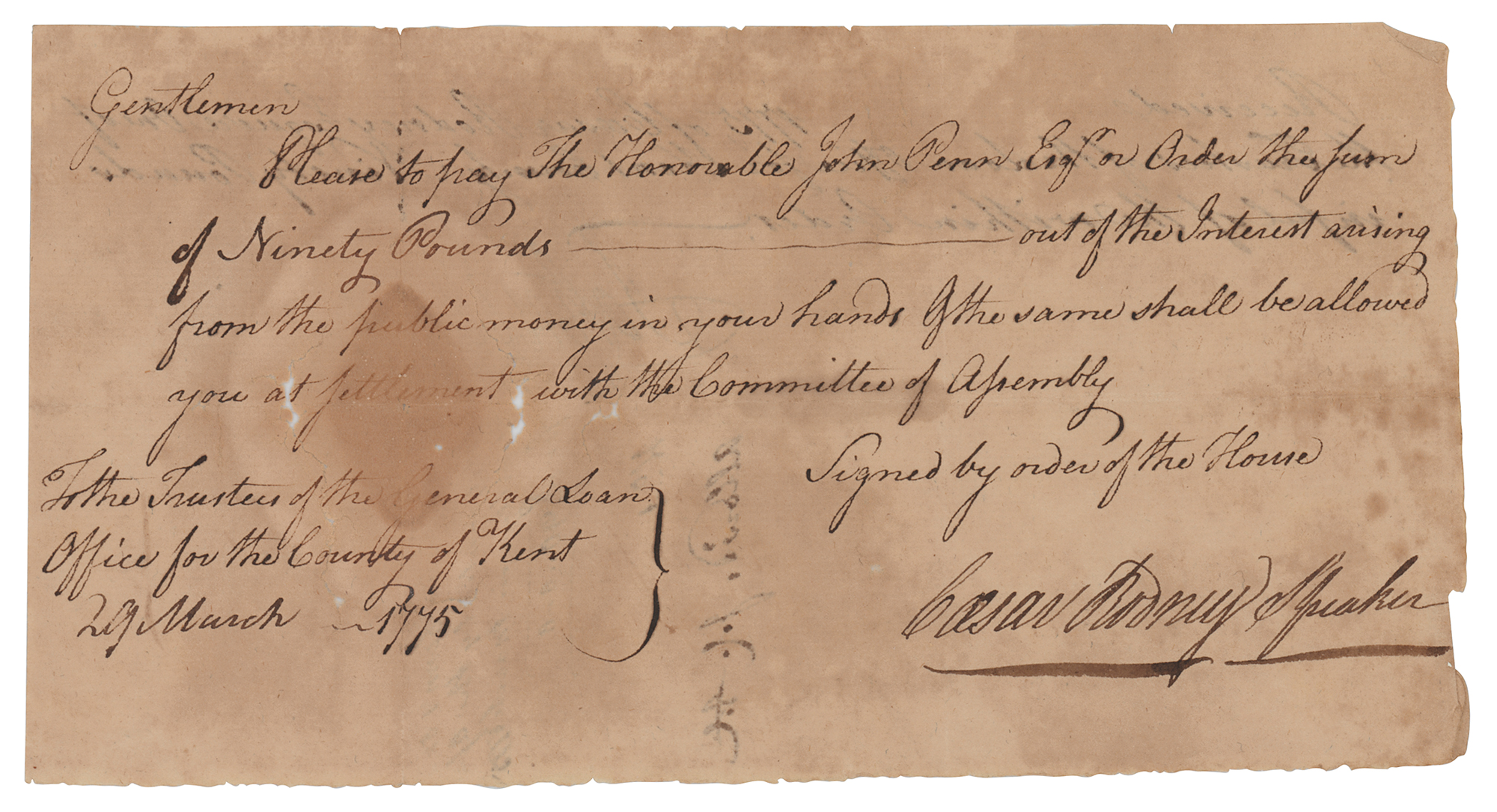 Signer of the Declaration of Independence from Delaware (1728-1784) who famously rode his horse 80 miles non-stop to break the deadlock within the Delaware delegation to vote in favor of independence on July 2, 1776. Manuscript DS, signed “Caesar Rodney, Speaker,” one page, 7.5 x 4, March 29, 1775. Pay order issued to the "Trustees of the General Loan Office for the County of Kent," in full: "Please to pay the Honorable John Penn Esqr. or Order the Sum of Ninety Pounds—out of the Interest arising from the public money in your hands & the same shall be allowed you at settlement with the Committee of Assembly." Signed at the conclusion by Rodney as Speaker of the Delaware General Assembly; also endorsed on the reverse by John Penn, then serving as the last governor of colonial Pennsylvania. In very good condition, with light soiling and foxing, and tears along the perimeter of a circular stain. A desirable autograph from a Declaration signer, dating to exactly three weeks before the Battles of Lexington and Concord.