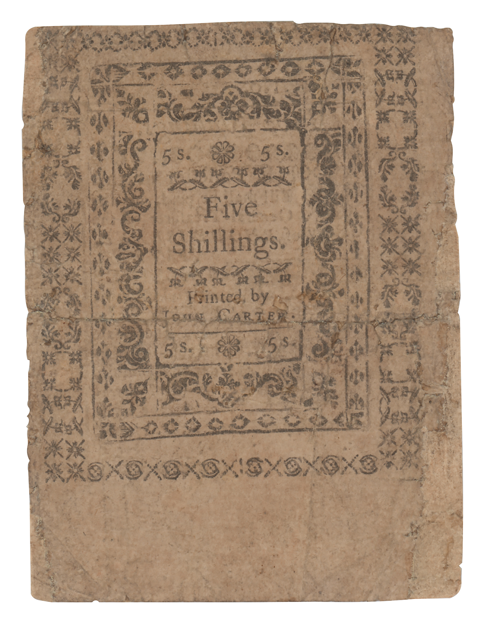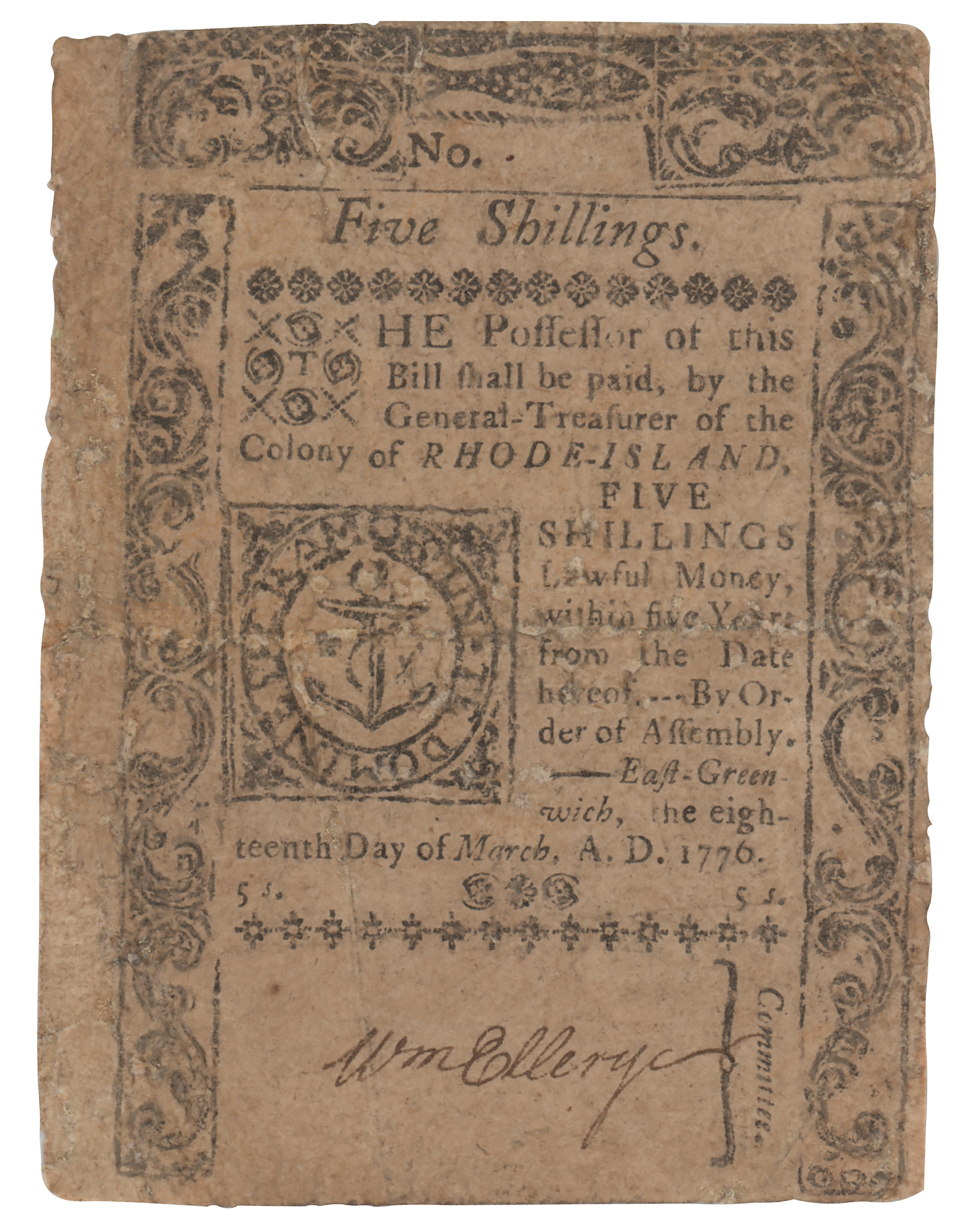 Revolutionary War-dated Rhode Island engraved bank note for "Five Shillings," signed “Wm. Ellery,” 2.5 x 3.5, reading: “The Possessor of this Bill shall be paid by the General-Treasurer of the Colony of Rhode-Island, Five Shillings, Lawful Money…the eighteenth Day of March, A.D., 1776.” Signed at the conclusion by William Ellery. In fine condition, with overall soiling.