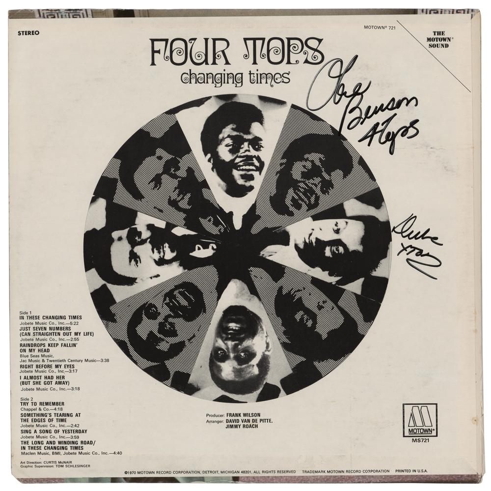 Changing Times album by the Four Tops, signed on the front cover in black felt tip by Levi Stubbs, Lawrence Payton, Duke Fakir, and Obie Benson, with the latter two also signing on the back cover. In fine condition. The record is included. An unusual example in that each band member has signed with their full names; historically, members typically signed first name only with the addition of the band name. The consignor notes that the Four Tops originally signed this album as a favor for David Gest.