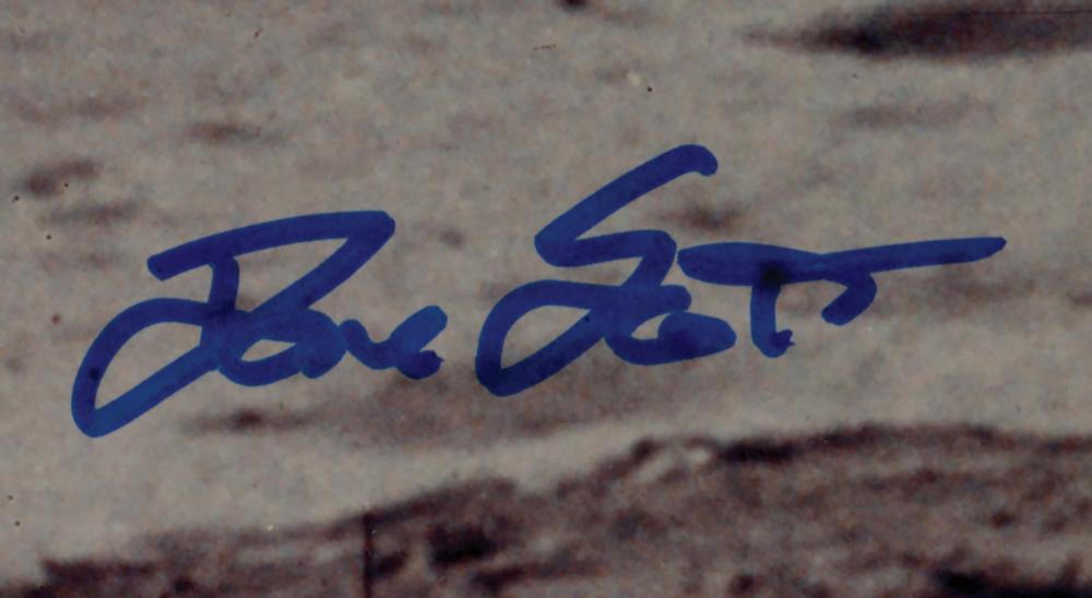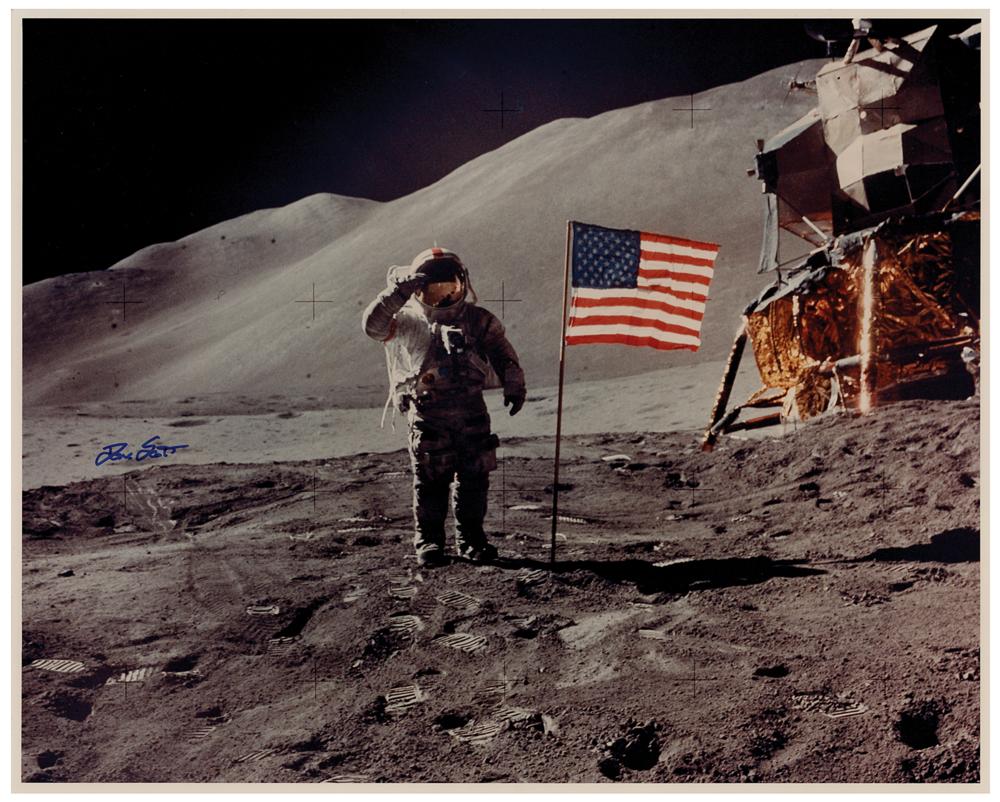 Color satin-finish 20 x 16 full-length photo of Commander Dave Scott saluting the American flag during the Apollo 15 mission, signed in blue felt tip. In fine condition.