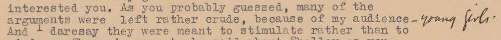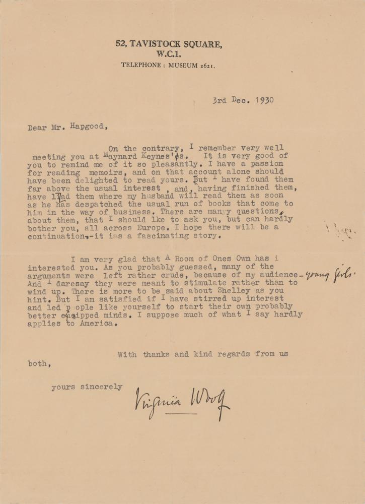 TLS, one page, 7.75 x 10.5, 52 Tavistock Square letterhead, December 3, 1930. Letter to Mr. Hapgood, presumably editor and author Norman Hapgood, in full: "On the contrary, I remember very well meeting you at Maynard Keynes'. It is very good of you to remind me of it so pleasantly. I have a passion for reading memoirs, and on that account alone should have been delighted to read yours. But I have found them far above the usual interest, and, having finished them, have laid them where my husband will read them as soon as he had despatched the usual run of books that come to him in the way of business. There are many questions about them, that I should like to ask you, but can hardly bother you, all across Europe. I hope there will be a continuation—it is a fascinating story. I am very glad that A Room of Ones Own has interested you. As you probably guessed, many of the arguments were left rather crude, because of my audience—young girls. And I daresay they were meant to stimulate rather than to wind up. There is more to be said about Shelley as you hint. But I am satisfied if I have stirred up interest and led people like yourself to start their own probably better equipped minds. I suppose much of what I say hardly applies to America. With thanks and kind regards from us both." Woolf adds "young girls" and makes a few corrections to the text in her own hand. In fine condition.