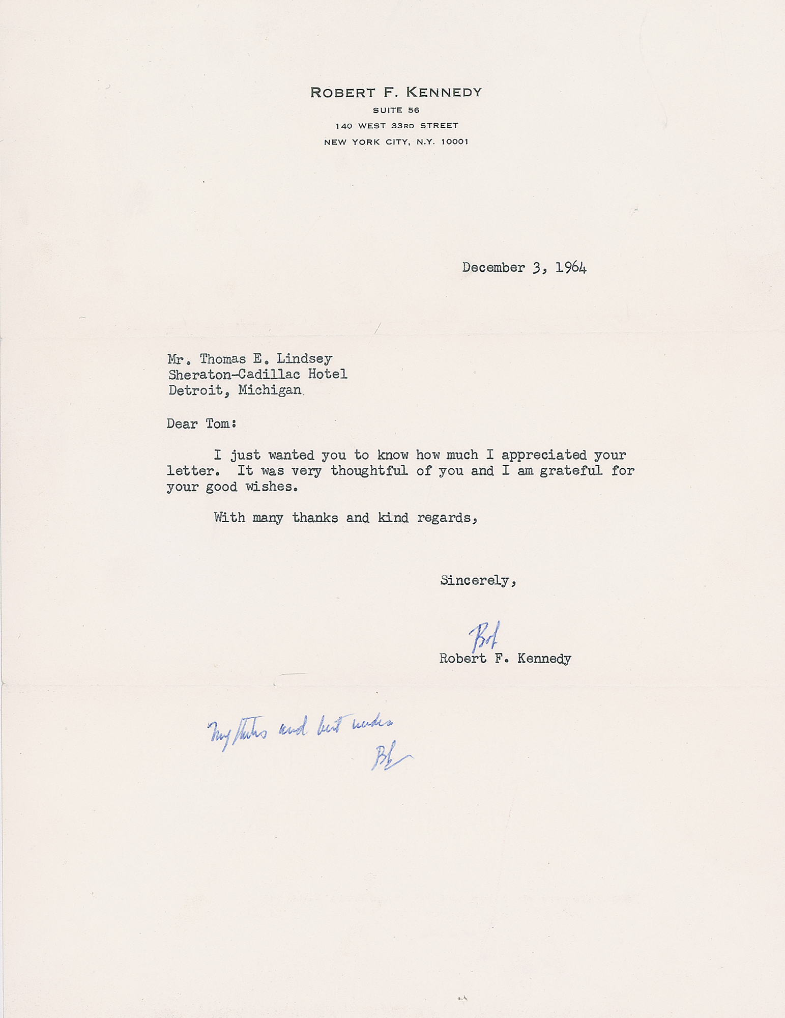 TLS signed “Bob,” one page, 8.5 x 11, personal letterhead, December 3, 1964. Brief letter to Thomas E. Lindsey, in full: "I just wanted you to know how much I appreciated your letter. It was very thoughtful of you and I am grateful for your good wishes." Kennedy adds a short handwritten postscript: "My thanks and best wishes, Bob." In fine condition. Accompanied by the original letter from Lindsey, who congratulates Kennedy on his "election to the United States Senate."