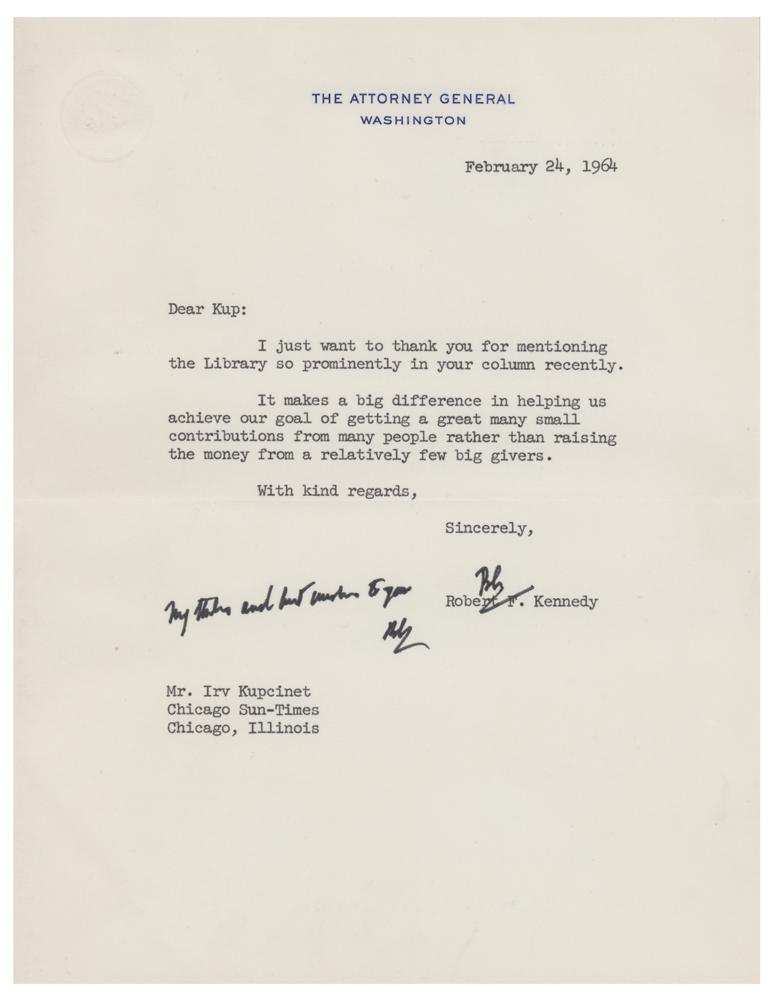 TNS signed “Bob,” one page, 7 x 9, Attorney General letterhead, February 24, 1964. Letter to Chicago Sun-Times columnist Irv Kupcinet, in full: "I just want to thank you for mentioning the Library so prominently in your column recently. It makes a big difference in helping us achieve our goal of getting a great many small contributions from many people rather than raising the money from a relatively few big givers." Kennedy adds a short handwritten postscript: "My thanks and best wishes to you, Bob." In very good to fine condition, with light creasing to the right side.