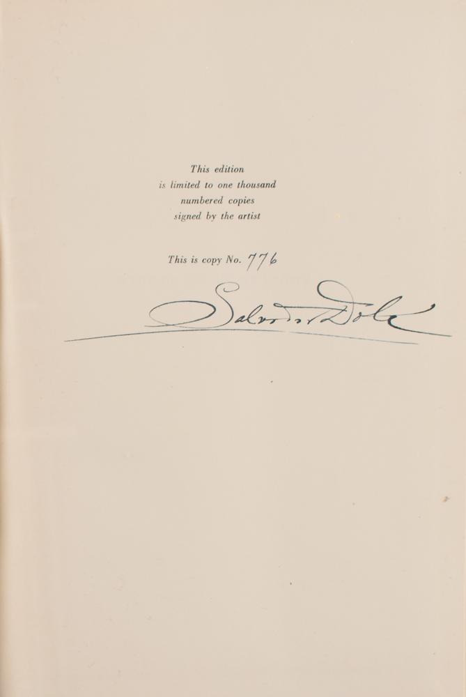 Signed book: Essays of Michel de Montaigne: Translated by Charles Cotton, Selected and Illustrated by Salvador Dali. Limited first edition, numbered 776/1000. NY: Doubleday & Company, 1947. Hardcover, 7 x 9.75, 472 pages. Signed nicely on the colophon in black ink by Dali. Autographic condition: fine. Book condition: VG+/None, with an ownership inscription to first free end page.