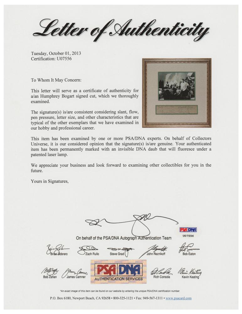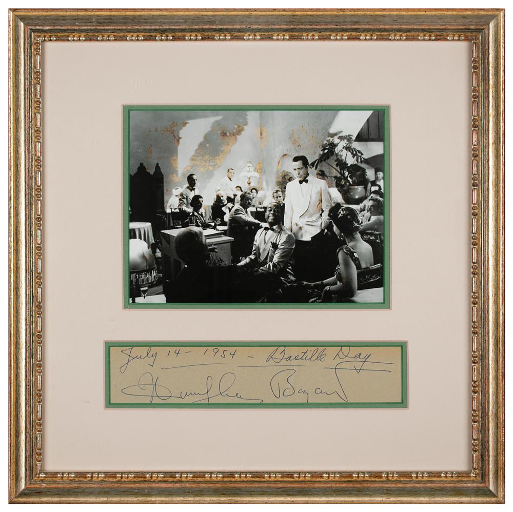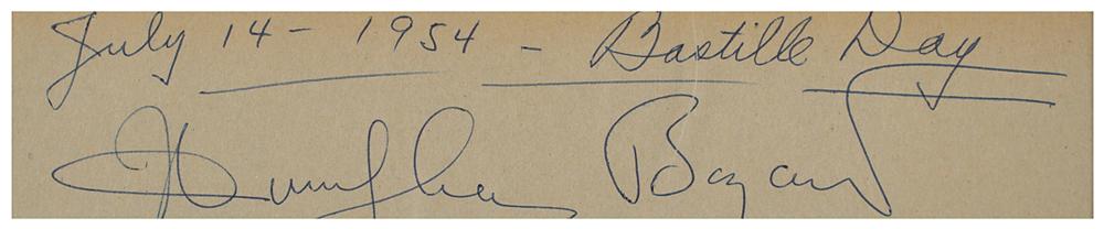 Huge vintage ballpoint signature, "Humphrey Bogart," headed at the top in an unknown hand, "July 14-1954-Bastille Day," on a 10 x 2 segment of a guest book page. Double-matted and framed to an overall size of 17.25 x 17.25. In fine condition, with deterioration to the photo, which could easily be replaced. Accompanied by a full letter of authenticity from PSA/DNA. Bogart's massive signature measures approximately 9.5″ long!