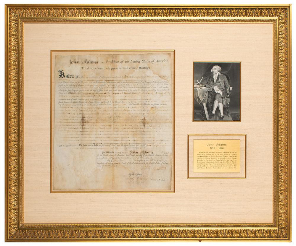 Partly-printed vellum DS as president, one page, 12.5 x 14.25, January 15, 1799. President John Adams, "in consideration of military service performed by Robert Thompson (a soldier for the war) to the United States, in the Virginia Line on Continental Establishment," grants a plot of land to an assignee containing "two hundred acres situate between the little Miami and Sciota Rivers, north-west of the River Ohio." Signed at the conclusion by President Adams and countersigned by Secretary of State Timothy Pickering. Matted and framed with a portrait and plaque to an overall size of 30.5 x 25.25. In very good condition, with overall staining, somewhat affecting the readability of the body of the document.