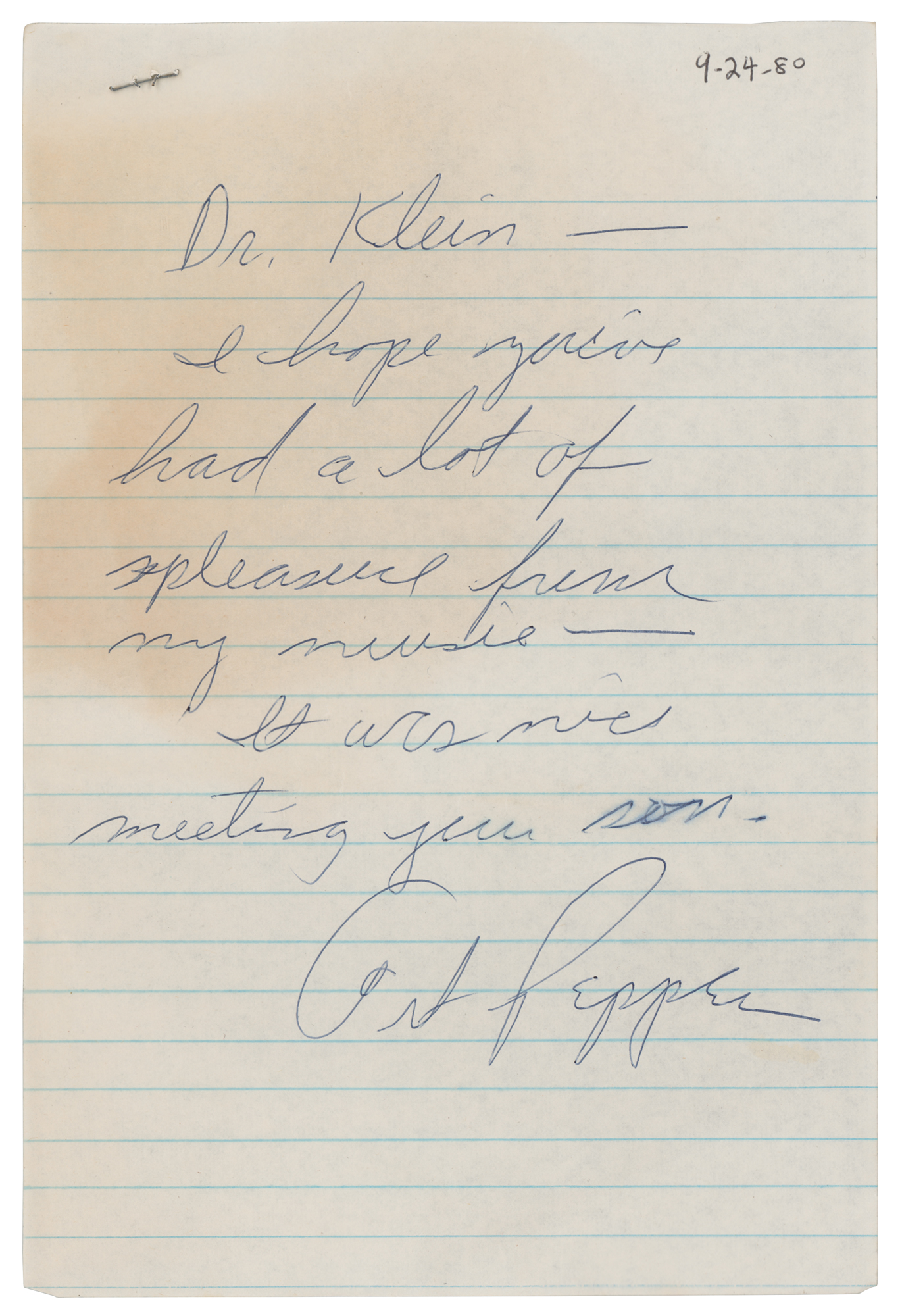 Two items: an ALS, one page, 6 x 9, dated September 24, 1980, in full: "Dr. Klein—I hope you've had a lot of pleasure from my music—It was nice meeting your son"; and an Intensity album by Art Pepper, who has signed the front cover in black felt tip. In overall fine condition, with some toning to the note. The record is included. Accompanied by a transmittal letter from the original recipient, who has forwarded the letter and album to his parents.