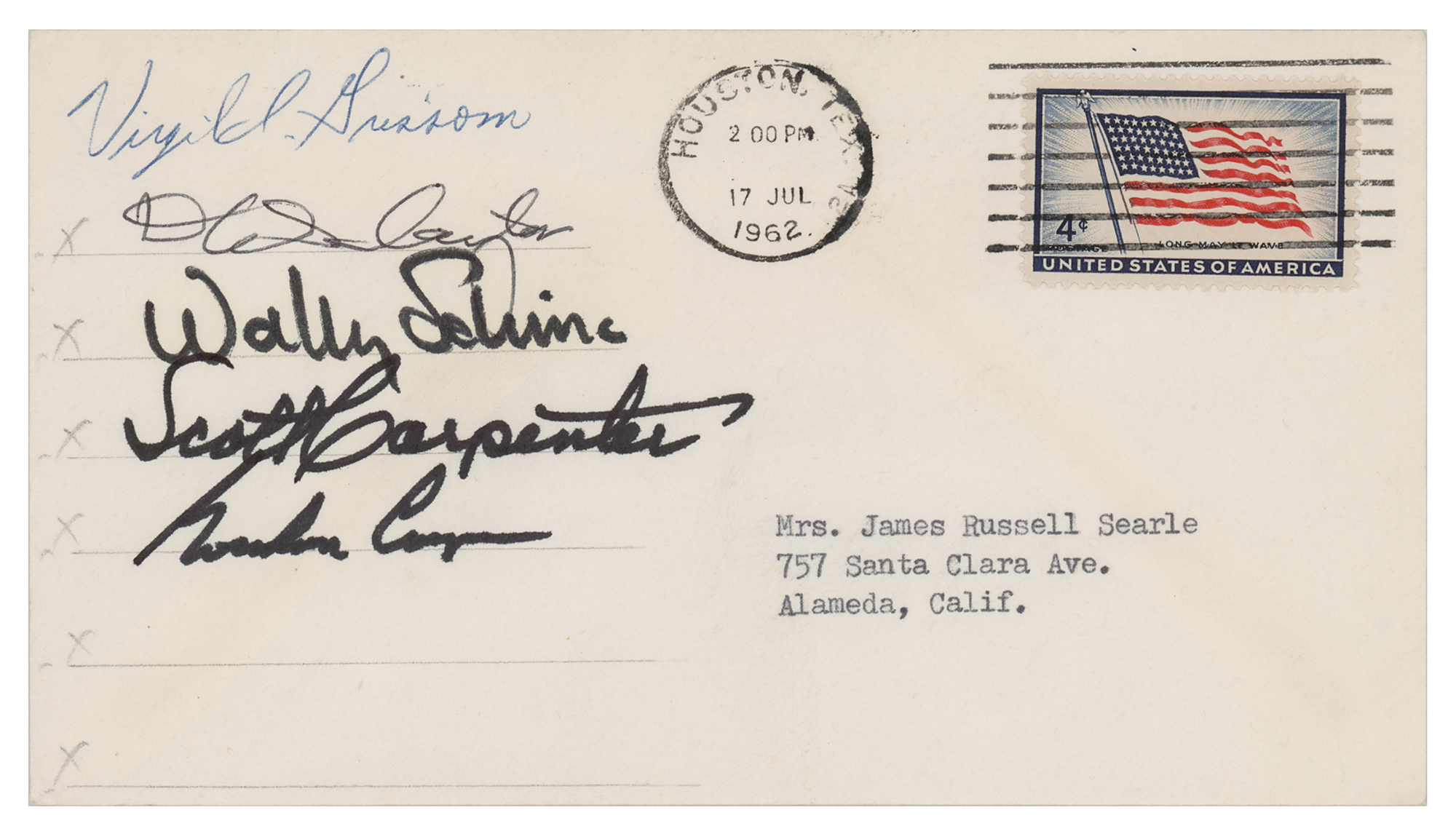 Mailing envelope, 6.5 x 3.5, postmarked at Houston on July 17, 1962, signed in blue ballpoint, "Virgil I. Grissom," in black ballpoint, "DK Slayton," and in black felt tip, "Wally Schirra," "Scott Carpenter," and "Gordon Cooper." In fine condition.