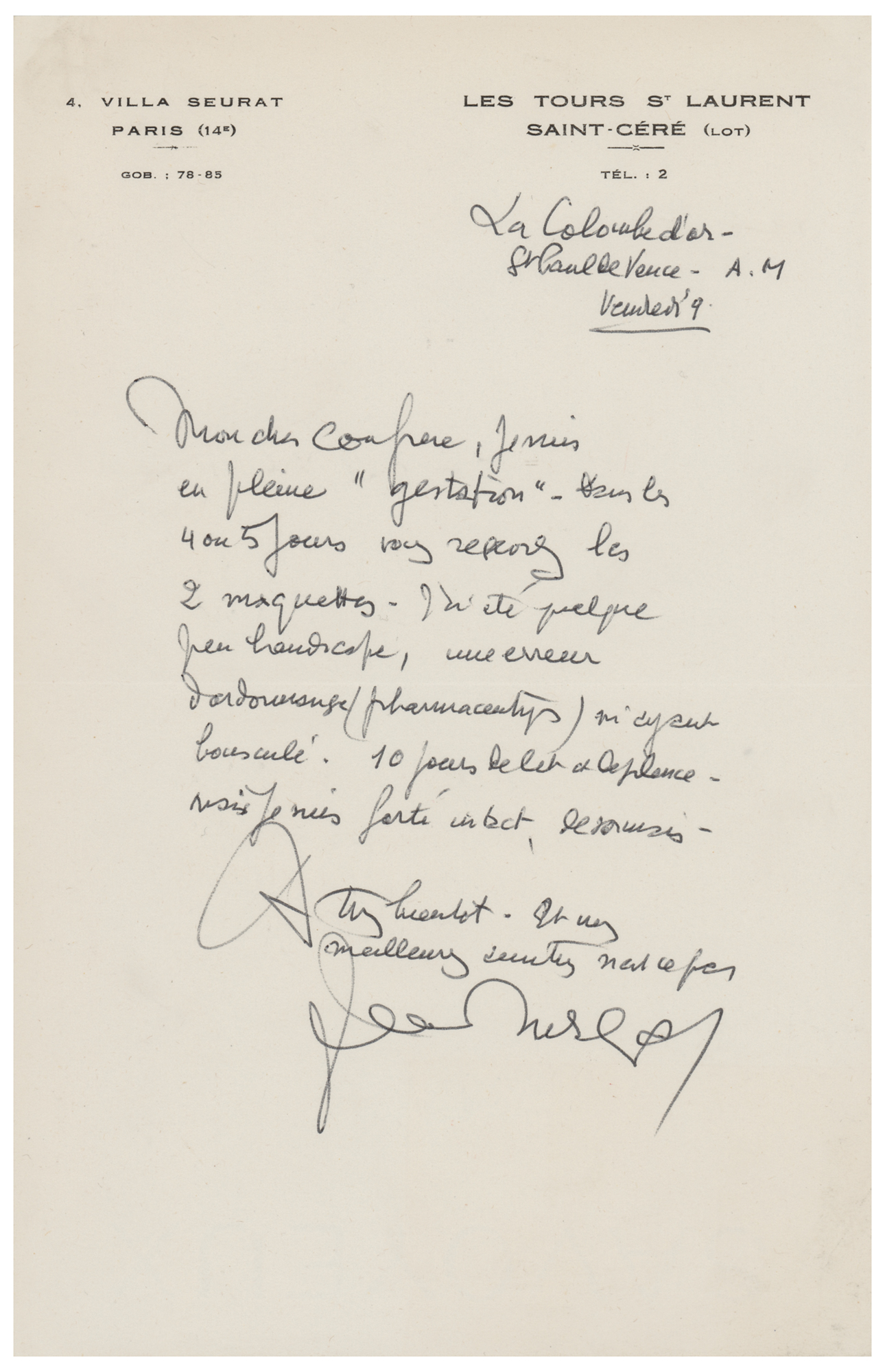 French artist noted for his role in the revival of contemporary tapestry (1892-1966). Untranslated ALS in French, one page, 5.25 x 8.25, Les Tours St. Laurent letterhead, no date. In fine condition.