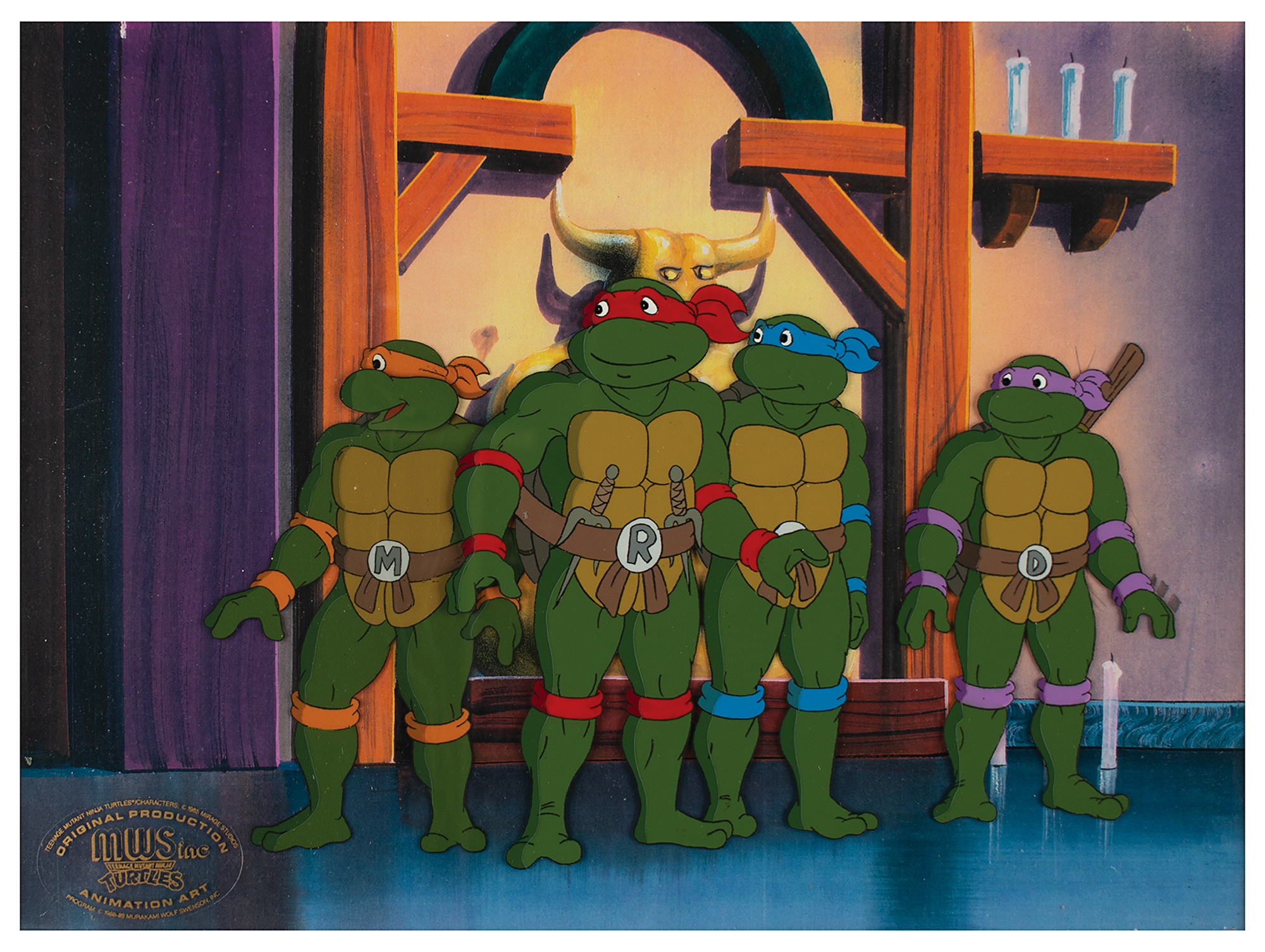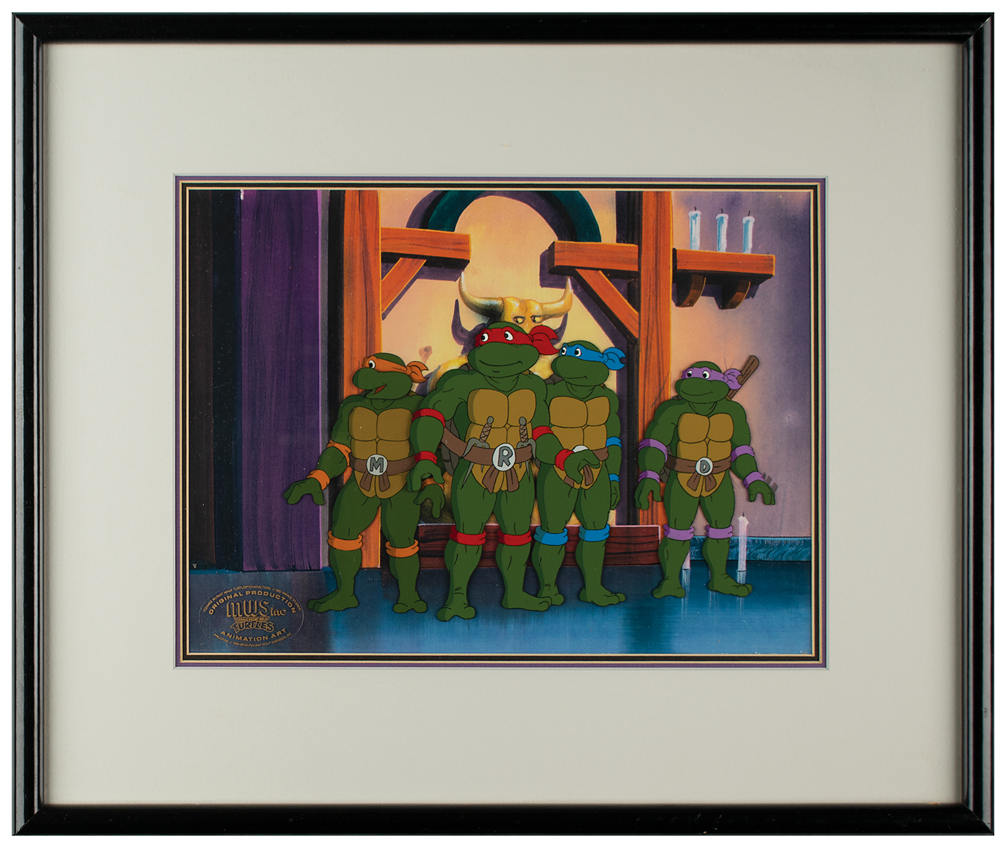 (Murakami-Wolf-Swenson, 1980s) Original production cels of Leonardo, Raphael, Donatello, and Michelangelo from a Teenage Mutant Ninja Turtles cartoon, which depicts the turtles in desirable full-length poses. The cels are placed on a matching studio copy background. Total character image measures 9.5 x 5.75, with a mat opening of 12 x 9. Triple-matted and framed to an overall size of 19 x 16. The piece has the golden MWS seal to lower left. In fine condition. Accompanied by a certificate of authenticity from Gallery Lainzberg.