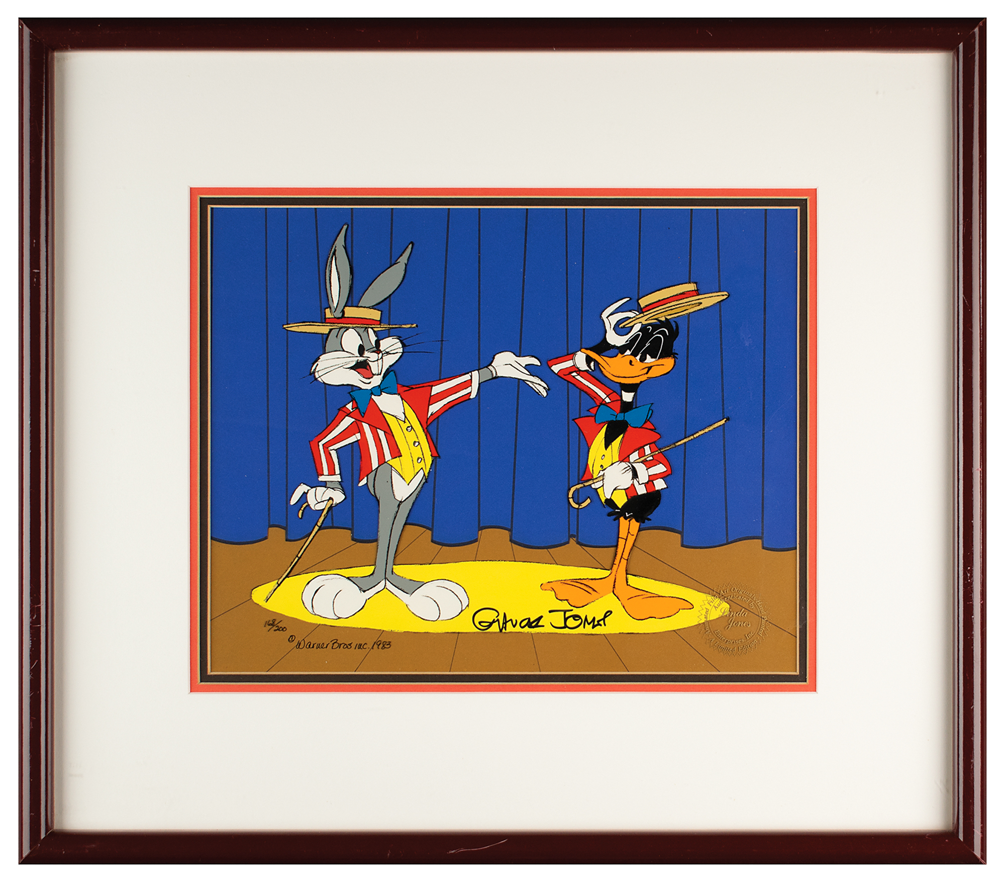 (Warner Brothers, 1983) Limited edition hand-painted animation cel entitled ‘Nite of Nites,' 12 x 9.5, numbered 168/200, signed in black felt tip by Chuck Jones. The scene shows Bugs Bunny and Daffy Duck on stage wearing striped coats and boater hats in excellent full-length poses. Lower right bears a golden Linda Jones Enterprises seal. Triple-matted and framed to an overall size of 19.5 x 17. In fine condition, with some scuffing to frame.