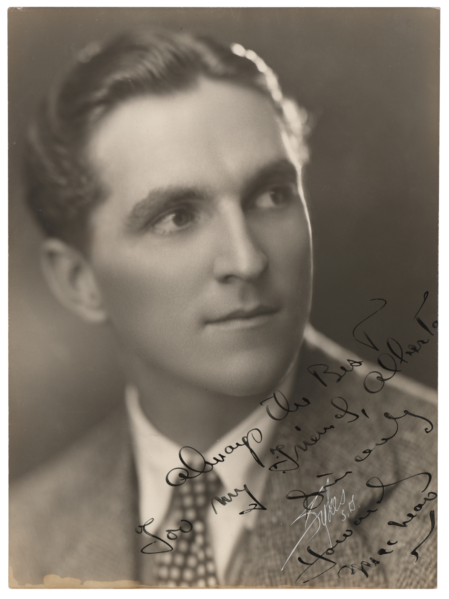Scarce vintage pearl-finish 6 x 8 photo of McNear early into his career, signed and inscribed in fountain pen, "Always the best, for my friend, Alberto, Sincerely, Howard McNear.” Lower portion signed in white ink by a Sykes Studio photographer. In fine condition, with trimmed edges, and a thin stain along the bottom edge. McNear remains elusive across all signed formats, and photos signed by him are virtually nonexistent. This particularly early example shows the actor decades before his memorable stint as chatty barber Floyd Lawson on The Andy Griffith Show—just the 2nd signed photo of McNear we have ever offered.