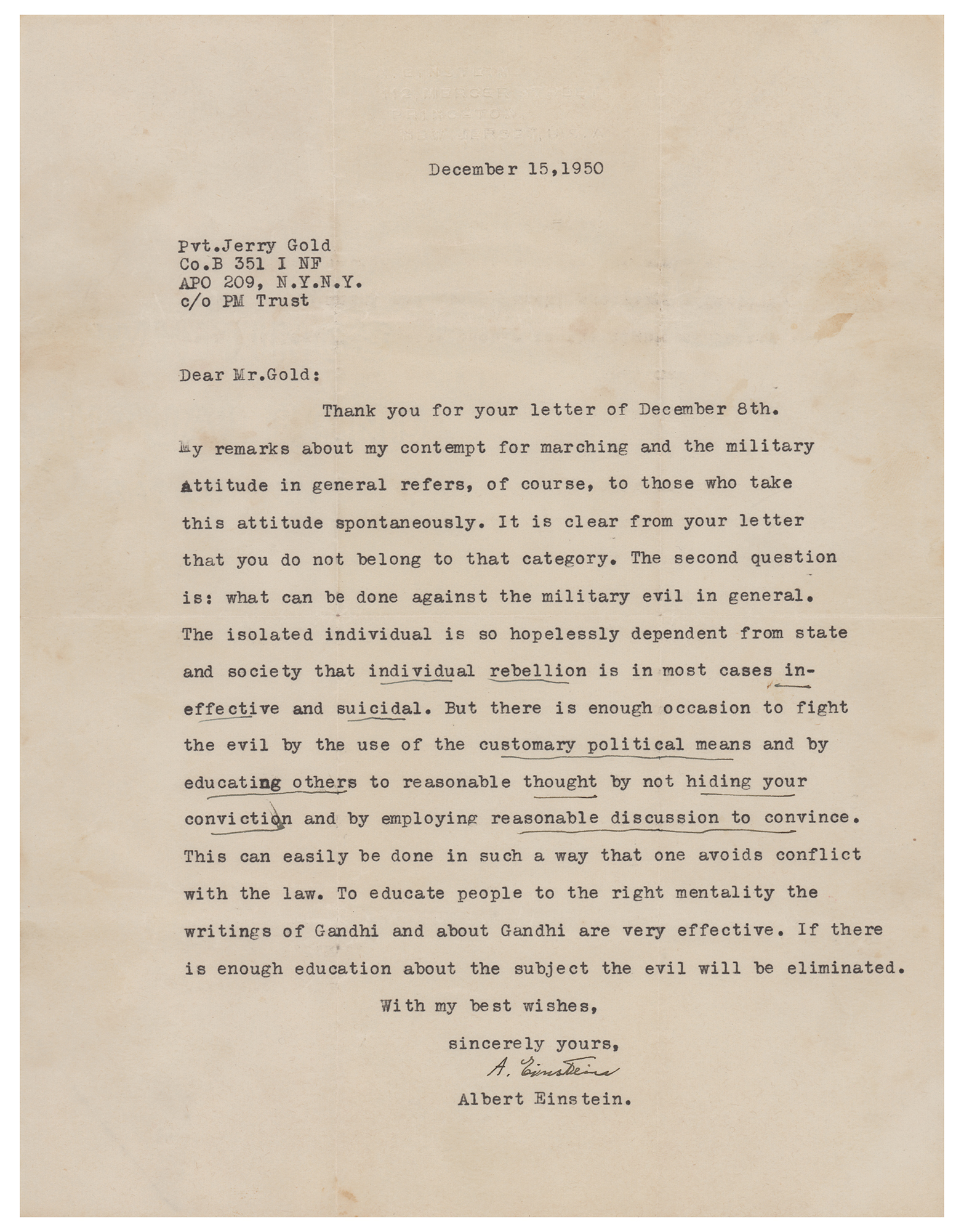 TLS signed “A. Einstein,” one page, 8.5 x 11, blindstamped personal Princeton letterhead, December 15, 1950. Insightful letter to Pvt. Jerry Gold, commenting on the military and society. In part: "My remarks about my contempt for marching and the military attitude in general refers, of course, to those who take this attitude spontaneously. It is clear from your letter that you do not belong to that category. The second question is: what can be done against the military evil in general. The isolated individual is so hopelessly dependent from state and society that individual rebellion is in most cases ineffective and suicidal. But there is enough occasion to fight the evil by the use of the customary political means and by educating others to reasonable thought by not hiding your conviction and by employing reasonable discussion to convince. This can easily be done in such a way that one avoids conflict with the law. To educate people to the right mentality the writings of Gandhi and about Gandhi are very effective. If there is enough education about the subject the evil will be eliminated." In very good to fine condition, with intersecting folds, light creasing, and portions of the text underlined in an unknown hand.