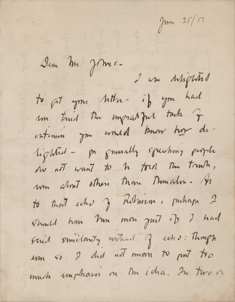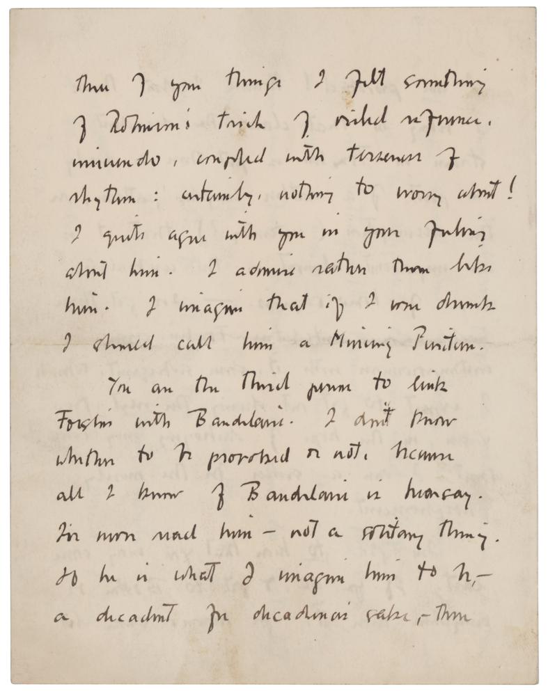 Pulitzer Prize-winning American poet, novelist, and writer of short stories (1889-1973). ALS, four pages on two adjoining sheets, 5 x 6.25, June 25, 1917. Handwritten letter to American poet Orrick Johns, responding to a comparison of his 1916 book of poetry, The Jig of Forslin: A Symphony, to the writing of Charles Baudelaire. In part: "I was delighted to get your letter?As to that echo of Robinson, perhaps I should have said more just if I had said similarity without?echo: though even so I did not mean to put too much emphasis on the idea. In two or three of your things I felt something of Robinson's trick of veiled reference?coupled with traces of rhythm: certainly nothing to worry about!?I imagine that if I were drunk I should call him a Mining Puritan.