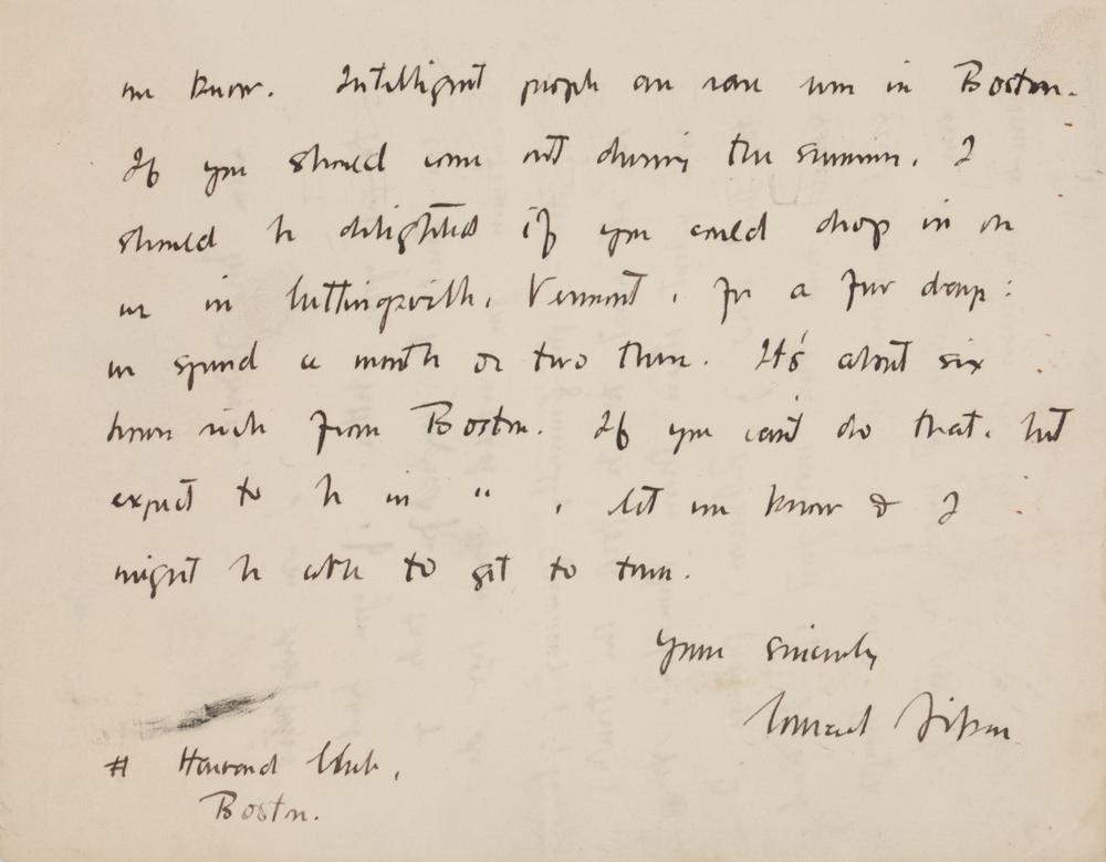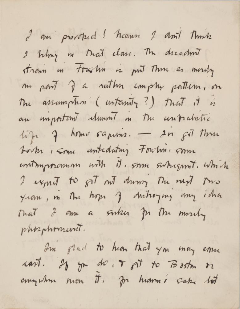 You are the third person to link Forslin with Baudelaire. I don't know whether to be provoked or not, because all I know of Baudelaire is hearsay. I never read him—not a solitary thing. So he is what I imagine him to be,—a decadent for decadence sake,—there, I am provoked! Because I don't think I belong in that class. The decadent stream in Forslin is put there merely as a part of a rather complex patter, on the assumption (certainty?) that it is an important element in the unrealistic life of Homo sapiens.—I've got three books, some anticeding Forslin, some contemporary with it, some subsequent, which I expect to get out during the next two years, in the hope of destroying any idea that I am a seeker for merely the phosphorescent. I am glad to know that you may come east. If you do, and get to Boston or anywhere near it, for heaven's sake let me know. Intelligent people are rare now in Boston. If you should come out during the summer, I should be delighted if you could drop in on us in Cuttingsville, Vermont?It's about six hours north of Boston. If you can't do that, but expect to be in Boston, let me know and I might be able to get to town." In fine condition.