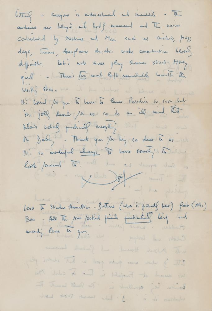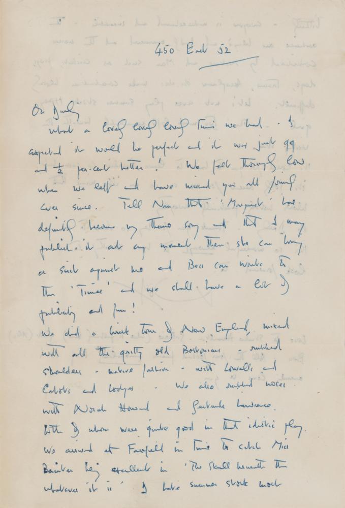 ALS signed “Noel,” one page both sides, 7.25 x 10.5, no date but postmarked August 2, 1947. Letter to actress Katharine Cornell, at her summer home 'Chip Chop' on Martha's Vineyard. In part: "What a lovely lovely lovely time we had. I expected it would be perfect and it was just 99 and 1/2 per-cent better! We felt thoroughly low when we left?Tell Nan that 'Marquiet' has definitely become my theme song and that I may publish it at any moment. Then she can bring a suit against me and Bea can write to the 'Times' and we shall have a lot of publicity and fun!