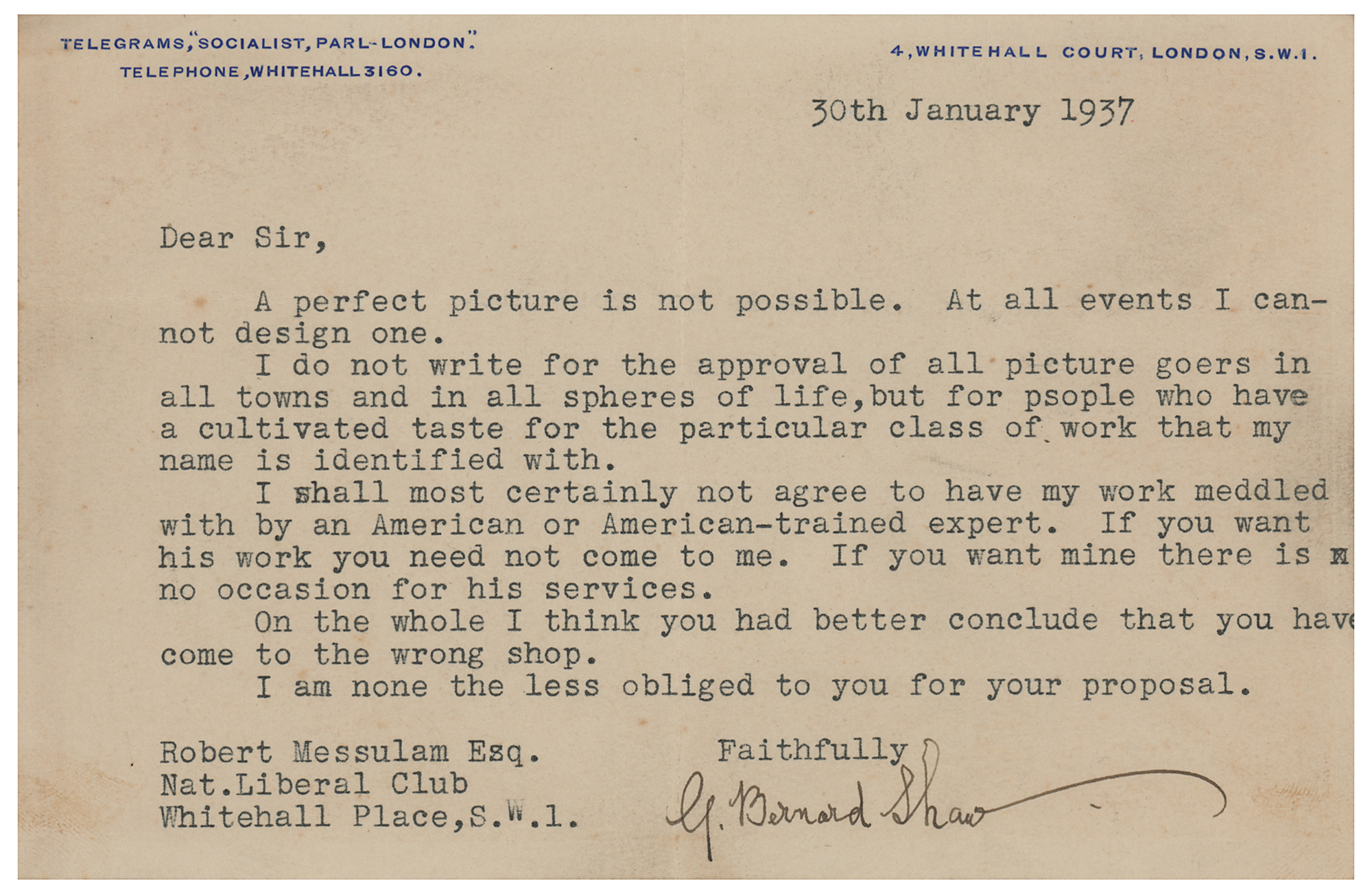 TLS signed “G. Bernard Shaw,” one page, 7 x 4.5, personal letterhead, January 30, 1937. Letter to Robert Messulam, in part: "A perfect picture is not possible. At all events I cannot design one. I do not write for the approval of all picture goers in all towns and in all spheres of life, but for people who have a cultivated taste for the particular class of work that my name is identified with. I shall most certainly not agree to have my work meddled with by an American or American-trained expert. If you want his work you need not come to me. If you want mine there is no occasion for his services. On the whole I think you had better conclude that you have come to the wrong shop." In fine condition, with old adhesive remnants along one reverse edge.