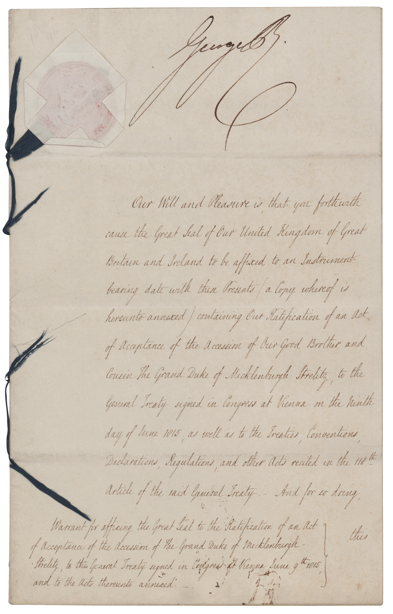 Manuscript DS, signed “George R,” one page both sides, 7.75 x 12.5, November 20, 1821. A "Warrant for affixing the Great Seal to the Ratification of an Act of Acceptance of the Accession of the Grand Duke of Mecklenburgh-Strelitz, to the General Treaty signed in Congress at Vienna, June 9th, 1815, and to the Acts thereunto annexed." Boldly signed at the head by King George IV, and signed at the conclusion by Robert Stewart, Viscount Castlereagh as "Londonderry." The crisply embossed white paper seal affixed to the upper left is intact. Attached to the document with a blue ribbon is a four-page manuscript transcript of the act of acceptance. In fine condition.