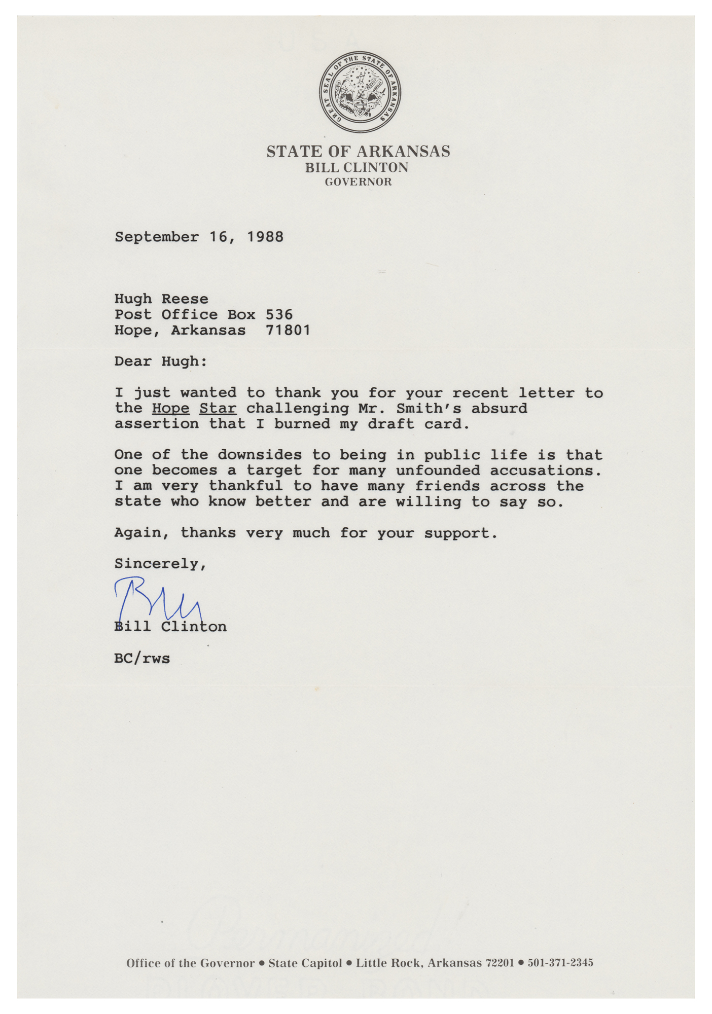 TLS signed “Bill,” one page, 7.25 x 10.5, State of Arkansas letterhead, September 16, 1988. Letter to Hugh Reese of Hope, Arkansas, in part: "I just wanted to thank you for your recent letter to the Hope Star challenging Mr. Smith's absurd assertion that I burned my draft card. One of the downsides to being in public life is that one becomes a target for many unfounded accusations. I am very thankful to have many friends across the state who know better and are willing to say so." In fine condition.