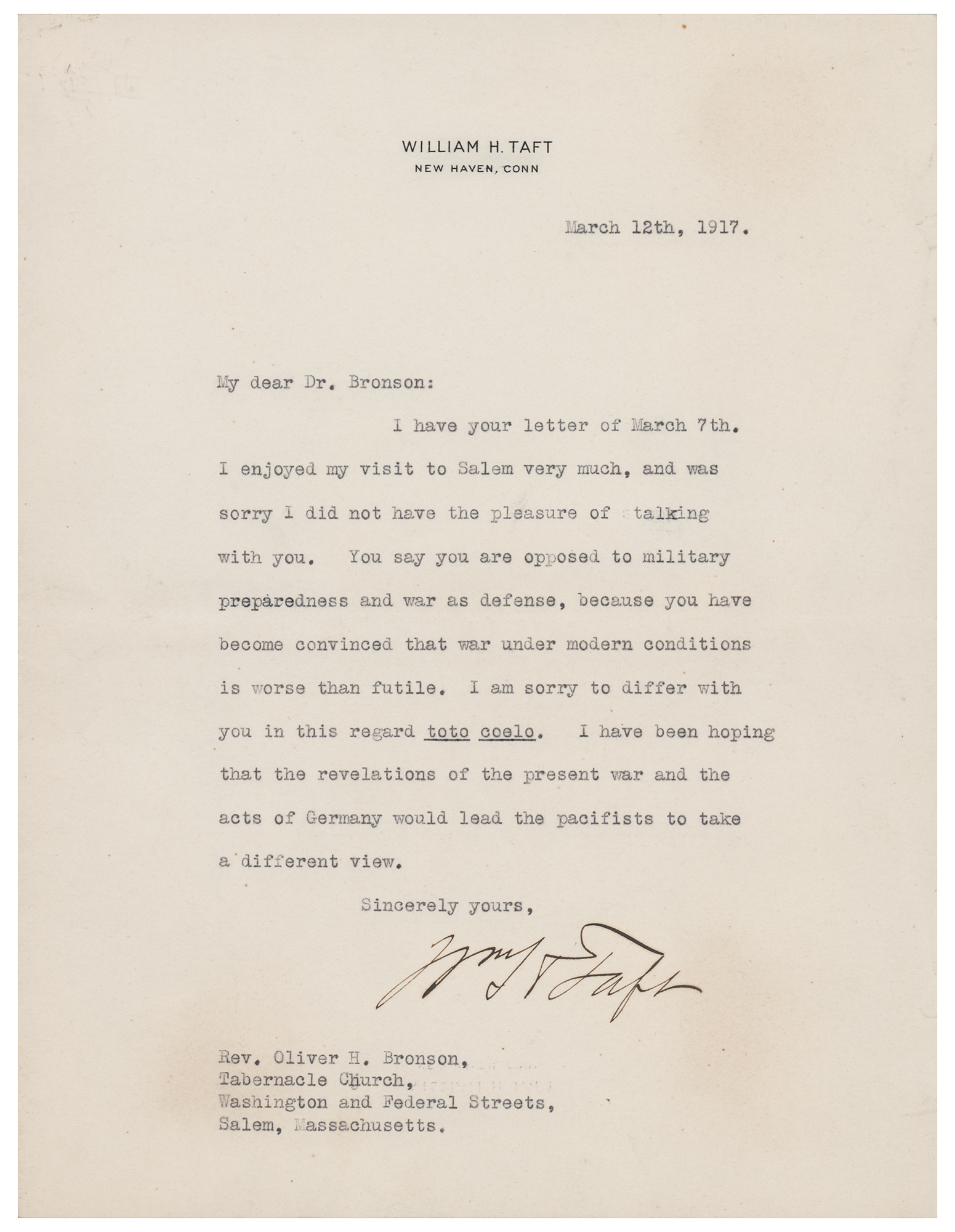 TLS signed “Wm. H. Taft,” one page, 7 x 9.25, personal letterhead, March 12, 1917. Letter to Rev. Oliver H. Bronson, in part: "I enjoyed my visit to Salem very much, and was sorry I did not have the pleasure of talking with you. You say you are opposed to military preparedness and war as defense, because you have become convinced that war under modern conditions is worse than futile. I am sorry to differ with you in this regard toto coelo. I have been hoping that the revelations of the present war and the acts of Germany would lead the pacifists to take a different view." In fine condition. Less than a month later, President Wilson, Taft's successor, went before Congress and asked for a declaration of war against Germany.