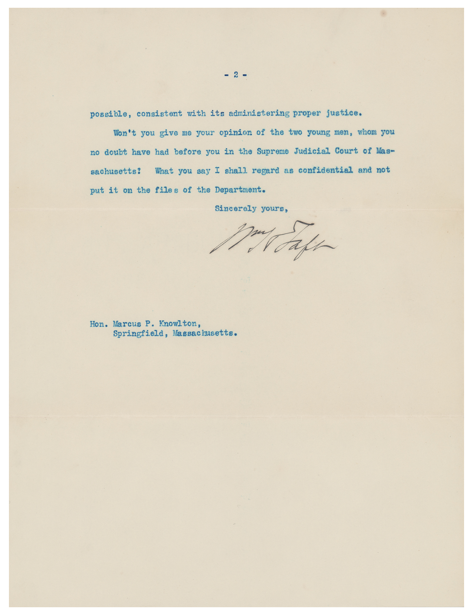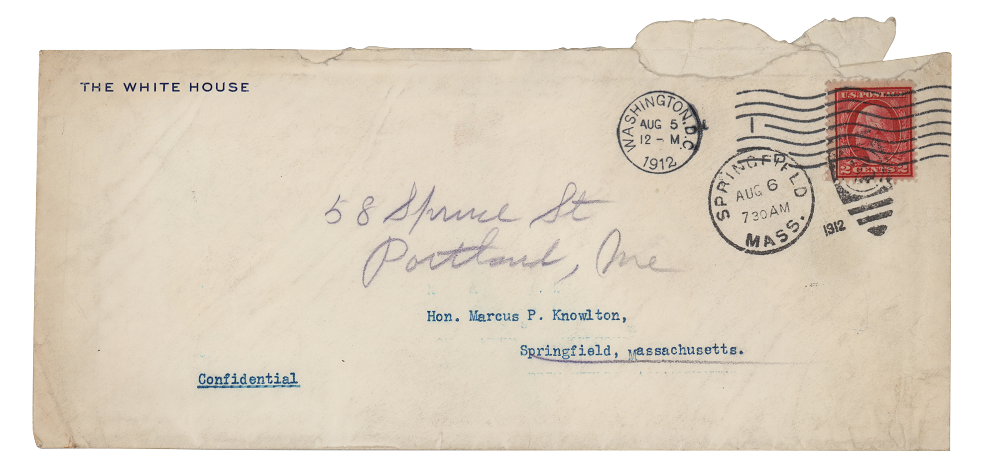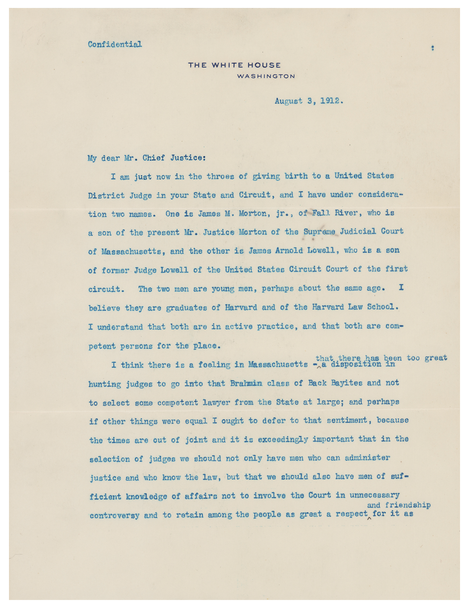 TLS as president signed “Wm. H. Taft,” two pages, 8 x 10.5, White House letterhead, August 3, 1912. Letter to former Chief Justice of the Massachusetts Supreme Judicial Court Marcus P. Knowlton, marked "Confidential." Writing while engaged in a three-way reelection campaign, Taft seeks to handle the matter of judicial appointments in a delicate way. In part: "I am just now in the throes of giving birth to a United States District Judge in your State and Circuit, and I have under consideration two names. One is James M. Morton, Jr., of Fall River, who is a son of the present Mr. Justice Morton of the Supreme Judicial Court of Massachusetts, and the other is James Arnold Lowell, who is a son of former Judge Lowell?The two men are young men, perhaps about the same age. I believe they are graduates of Harvard and of the Harvard Law School. I understand that both are in active practice, and that both are competent persons for the place.