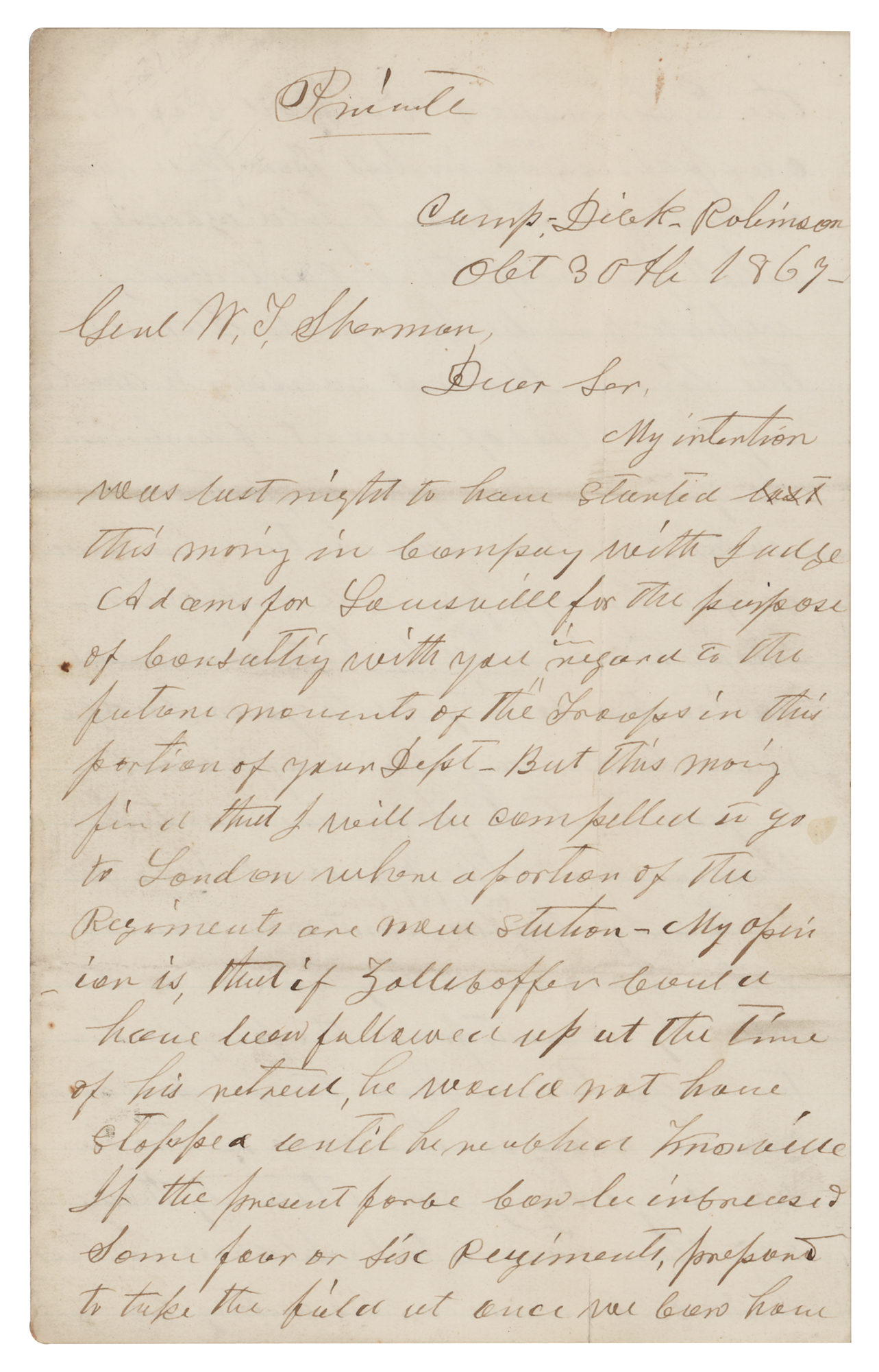 Civil War-dated ALS, four pages on two adjoining sheets, 5 x 8, October 30, 1861. Handwritten letter to "Genl. W. T. Sherman," written from Camp Dick Robinson and marked "Private." In part: "My intention was last night to have started this morning in company with Judge Adams for Louisville for the purpose of consulting with you in regard to the future movements of the Troops in this portion of your Dept. But this morning I find that I will be compelled to go to London where a portion of the Regiments are now stationed. My opinion is, that if Zollicoffer could have been followed up at the time of his retreat, he would not have stopped until he reached Knoxville. If the present force can be increased some four or six Regiments, be prepared to take the field at once we can have the E. Tennessee & Va. Rail Road in our possession in less than three weeks with sufficient force to hold it against the whole power of the S. Confederacy which can be brought to bear at this time.
