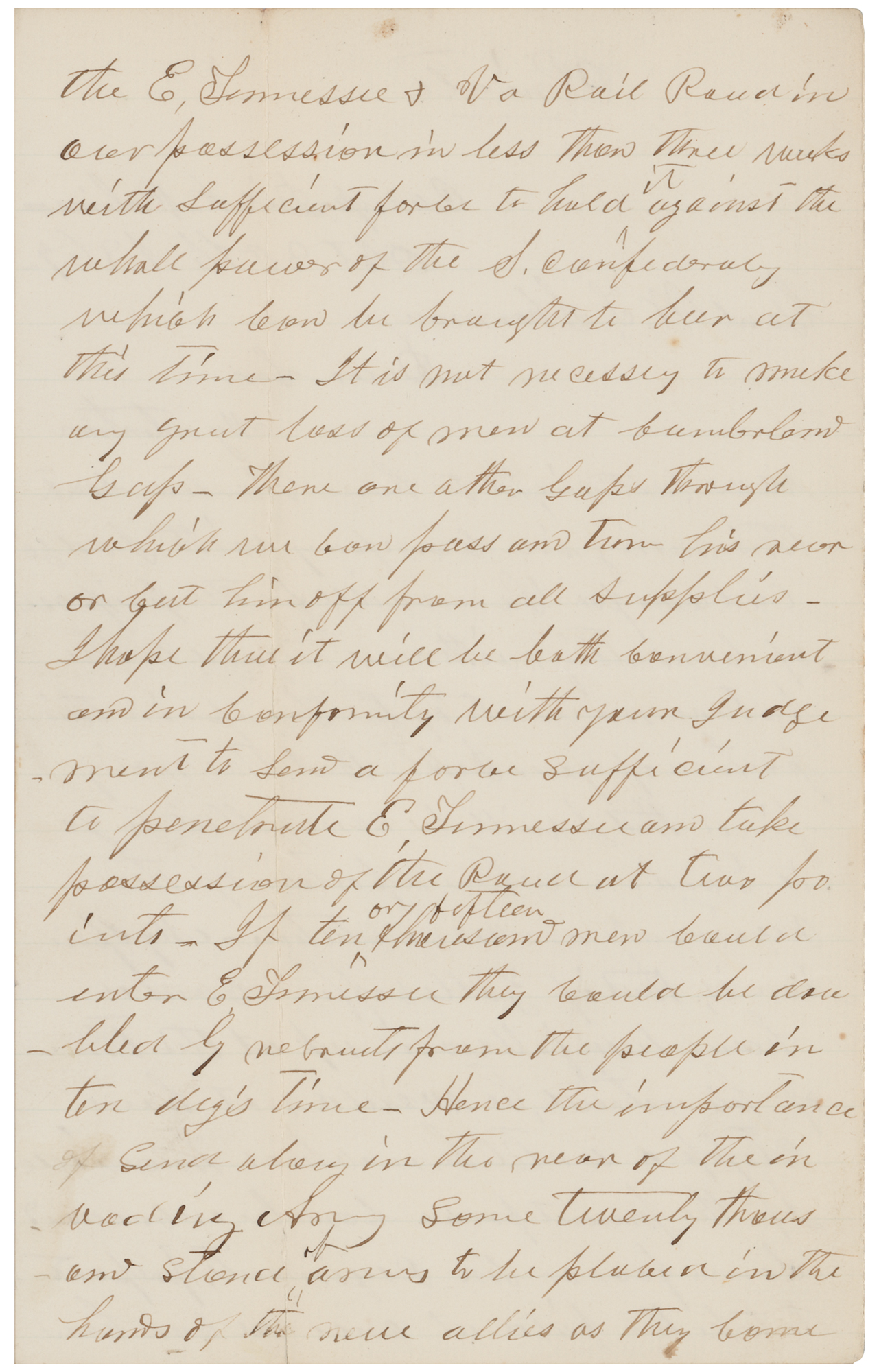 It is not necessary to make any great loss of men at Cumberland Gap. There are other Gaps through which we can pass and turn his rear or cut him off from all supplies. I hope that it will be both convenient and in conformity with your Judgment to send a force sufficient to penetrate E. Tennessee and take possession of the Road at two points. If ten or fifteen thousand men could enter E. Tennessee they could be doubled by recruits from the people in ten day's time. Hence the importance of send[ing] along in the rear of the invading Army some twenty thousand stand of arms to be placed in the hands of the new allies as they come to our standard.