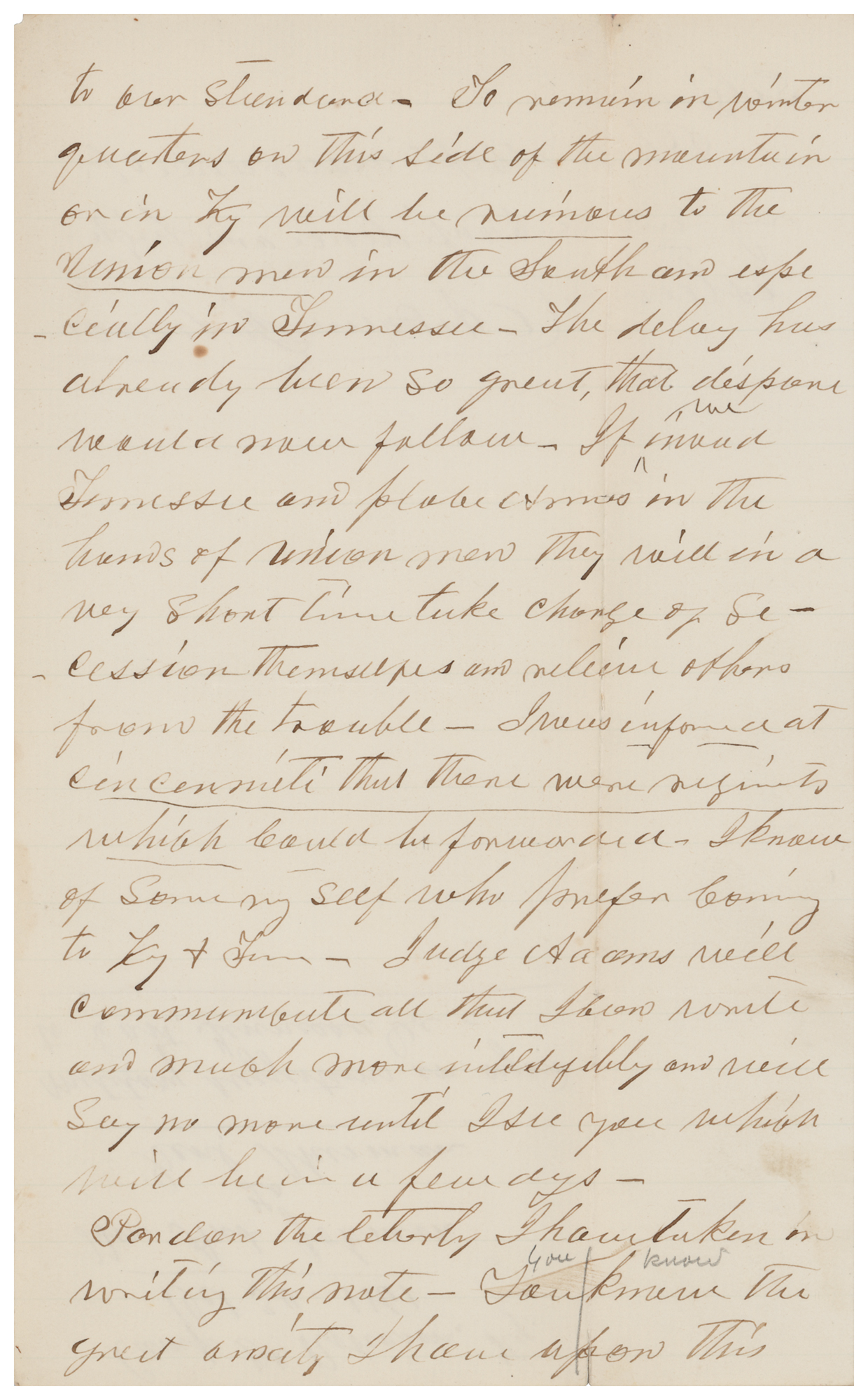 To remain in winter quarters on this side of the mountain or in Ky. will be ruinous to the Union men in the South and especially in Tennessee. The delay has already been so great that [despair?] would now follow. If we invade Tennessee and place Arms in the hands of Union men they will in a very short time take charge of Secession themselves and relieve others from the trouble. I was informed at Cincinnati that there were regiments which could be forwarded. I know of some myself who prefer coming to Ky. & Tenn. Judge Adams will communicate all that I can write and much more intelligibly and will say no more until I see you which will be in a few days." In very good to fine condition, with old tape repairs fold separations.