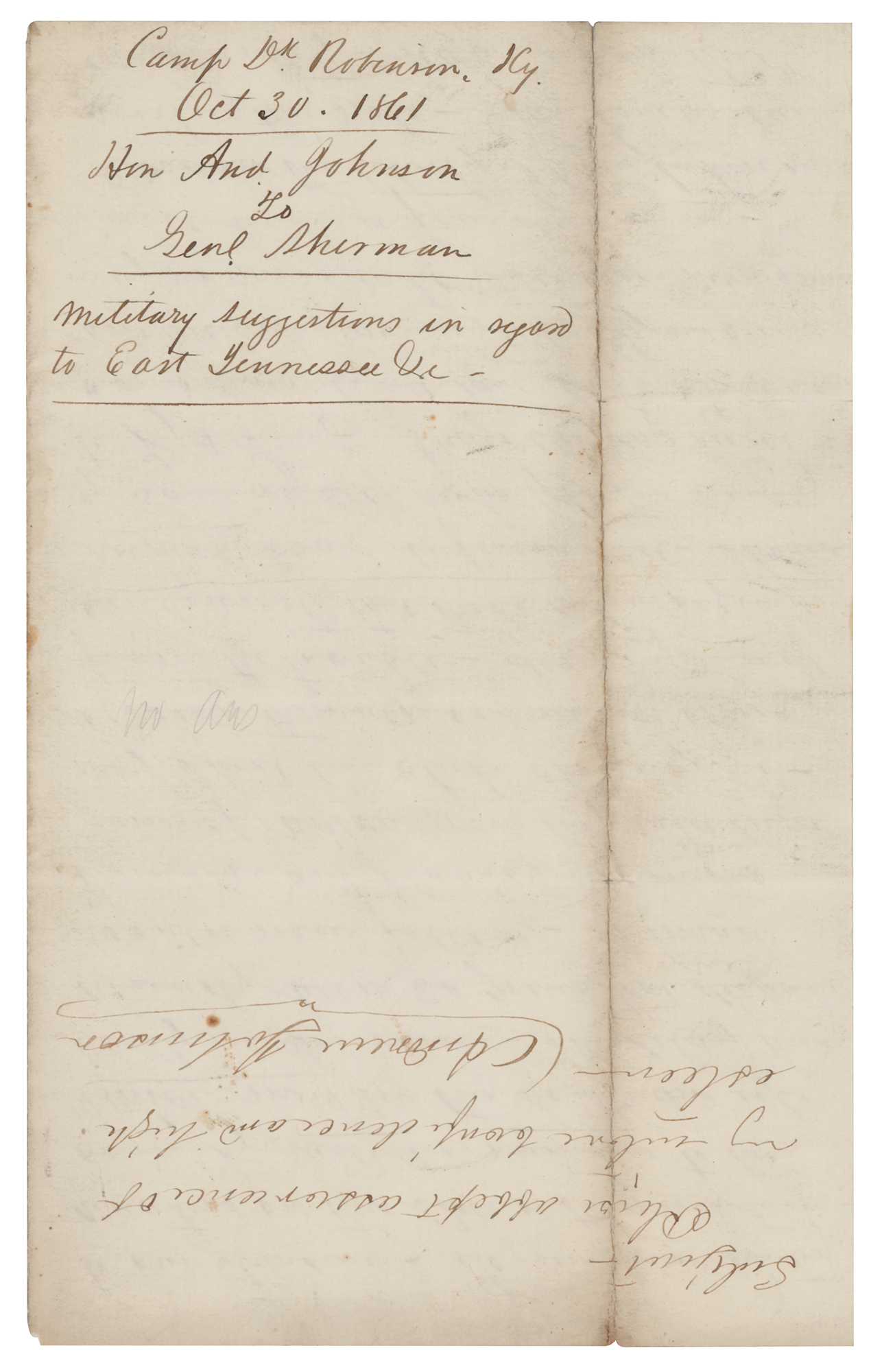 In this remarkable letter from early in the Civil War, Johnson—then a US Senator from the recently-seceded Tennessee—writes to General William T. Sherman, who had principal military responsibility for Kentucky, a border state in which Confederate troops held Columbus and Bowling Green. Newly minted Confederate general Felix Zollicoffer had occupied the Cumberland Gap, and in mid-October marched 40 miles from Cumberland Gap to London, Kentucky. Just nine days before this letter, at the Battle of Wildcat Mountain on October 21, Zollicoffer's troops were stymied by a prepared Union force fighting on rugged terrain, and he was forced to retreat into rural eastern Tennessee. This was one of the first Union victories of the Civil War.