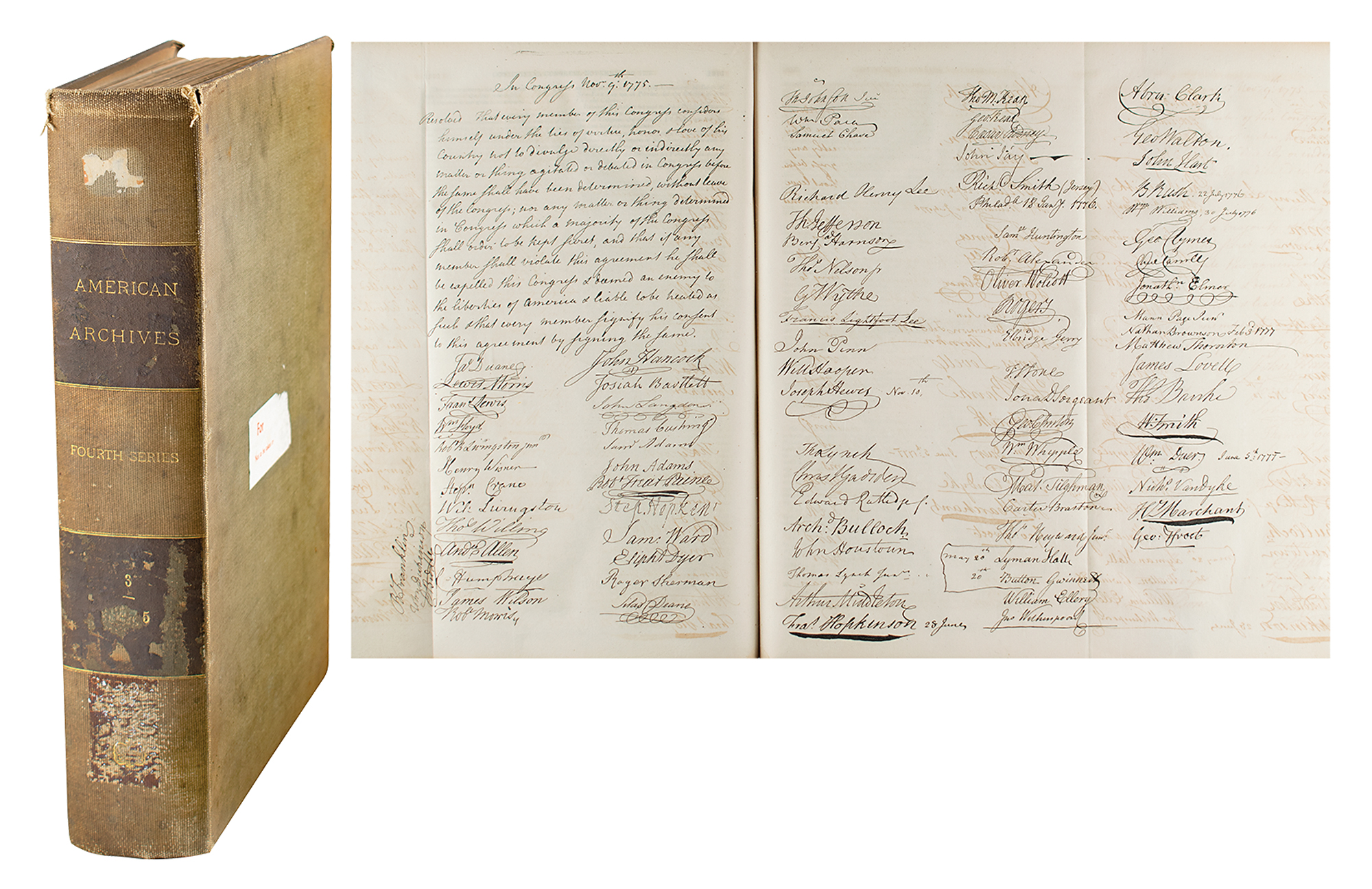 Rare book: American Archives: Fourth Series, Vol. III. Washington: Published by M. St. Clair Clarke and Peter Force, 1840. Hardcover, 9.5 x 14.25, highlighted by the scarce facsimile of the Continental Congress Agreement of Secrecy of November 9, 1775, one of the most important documents from Force's monumental collection of American historical papers. Not unlike Force's famous facsimile of the Declaration of Independence contained in American Archives (Fifth Series, Vol. I), very few facsimile copies of the 1775 Secrecy Agreement exist. Force's Archives were not a success: only the Fourth and Fifth Series were ever published, and even these were severely undersubscribed. In consequence, how many copies of the 1775 Agreement were printed, and how many were inserted into the volumes, remains uncertain. As the projected edition of the work was 1500 copies, that is likely the maximum; it remains possible that as few as 500 were actually completed. Of these, relatively few appear to survive—either by themselves or folded into the book. Print condition: very good, with expected ink transfer. Book condition: VG-/None, with cracked hinges, ex-library markings, torn label to front board, and some staining, scuffing, and removed labels to spine.