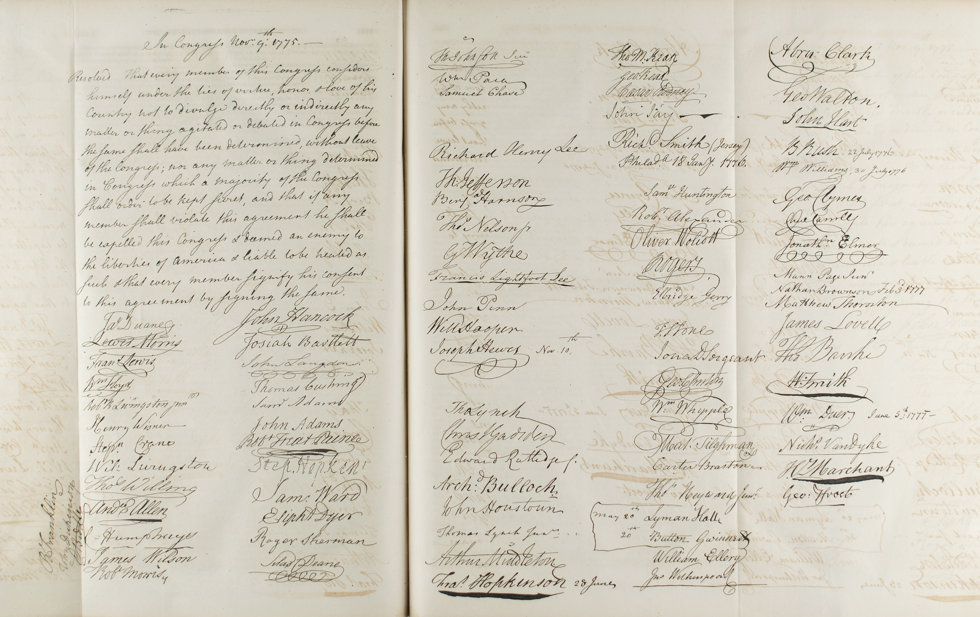 Penned by Continental Congress secretary Charles Thomson and signed by 87 Continental Congressmen, the original manuscript of the Agreement of Secrecy is now held by the United States National Archives, and is one of the priceless wonders from America's foundation. Among the signers are famed founders like John Hancock, Benjamin Franklin, John Adams, Thomas Jefferson, Thomas Lynch, Button Gwinnett, John Jay, and others.