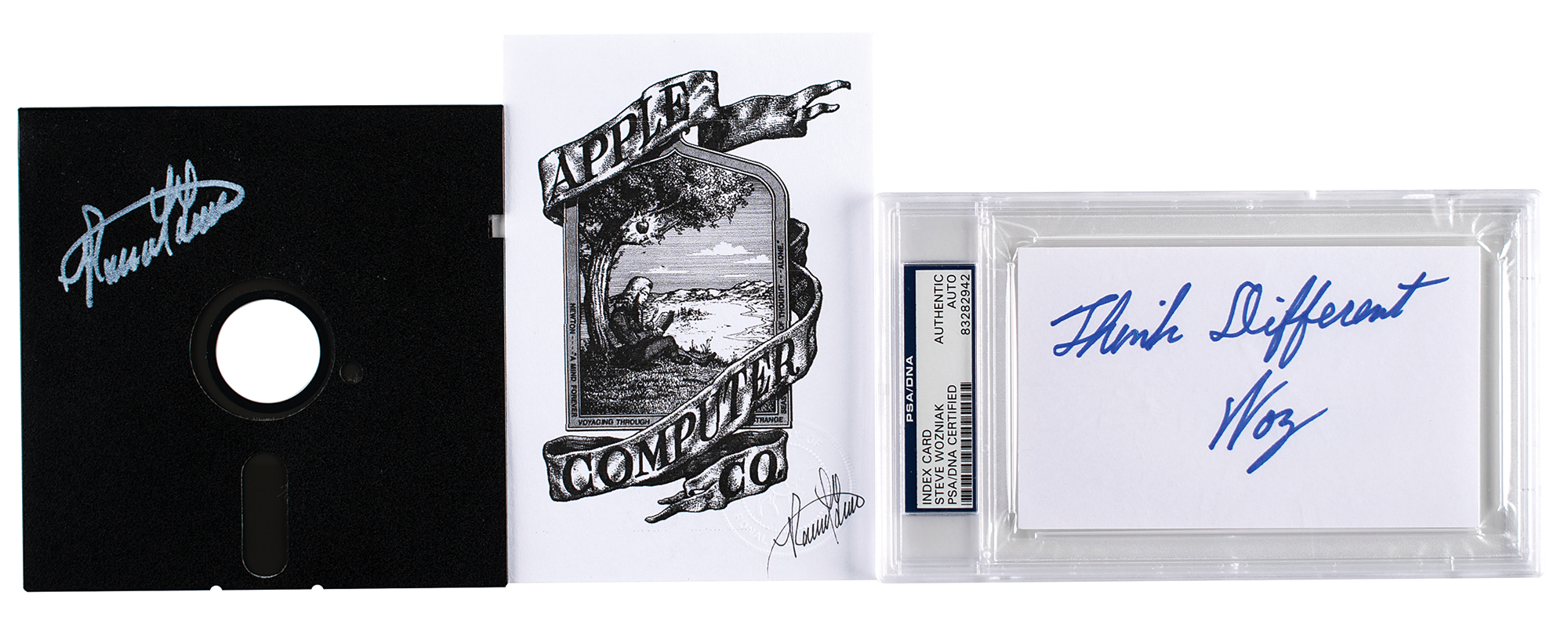 Three items signed by two of Apple's cofounders: a desirable felt tip signature and quote by Steve Wozniak, "Think Different, Woz," on a white 5 x 3 card, encapsulated by PSA/DNA; a 4 x 6 print of the original Apple Computer Co. logo designed by Eon Wayne, signed in black felt tip, "Ronald Wayne"; and a black 5.25″ floppy disk, signed in white ink, "Ronald Wayne." In overall very fine condition.