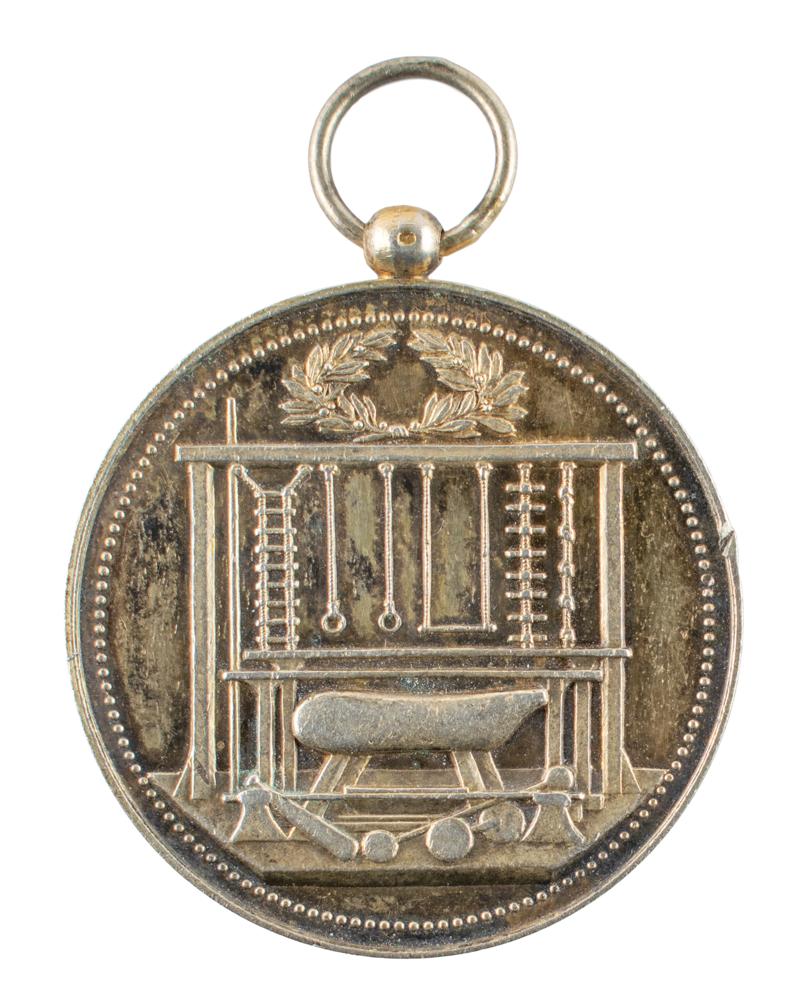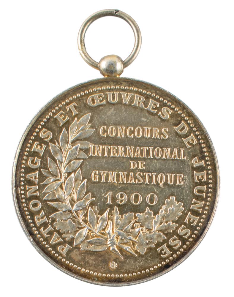 Unusual participation medal issued for gymnastics at the Paris 1900 Olympics. Silvered bronze, 44 mm, 33 gm. The front depicts an embossed laurel branch with raised text in French (translated): “Patronage and Youth Work, International Gymnastics Competition, 1900”; and the reverse features a laurel wreath over a variety of exercise and gymnastics equipment. The medal bears some light marks and areas of discoloration.