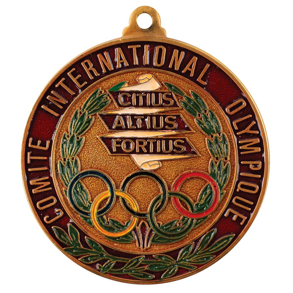 Uncommon gold-tone International Olympic Committee (IOC) badge of office, 62 gm, 51 mm; the front features embossed Olympic rings, laurel wreath, and motto, with raised text against red enamel border: “Comite International Olympique”; the reverse is blank. The badge includes its original braid necklace. The medal bears a couple trivial marks to its edge, and is accompanied by its attractive original red presentation case.