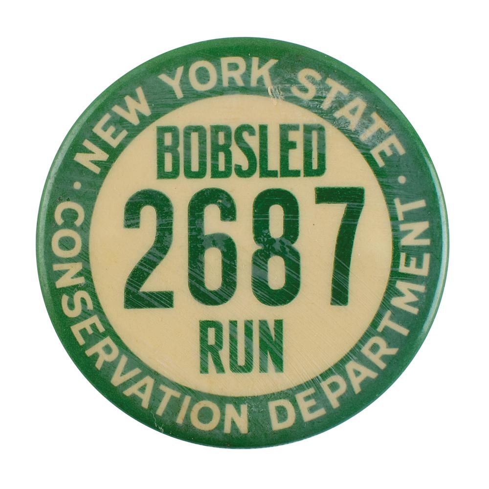 Scarce original waiver button pin issued by the New York State Conservation Department. These buttons were distributed for three winter seasons only: 1930-1931, 1931-1932, and 1932-1933, with this example dating to the final season. They were given to visitors of the Lake Placid Olympic bobsled track, who paid to take rides on the course. The green-and-white pin, 1.75″ in diameter, is numbered as "Bobsled Run, 2687." Bottom edge marked: "Bastian Bros. Rochester, NY." In fine condition, with rust to back.