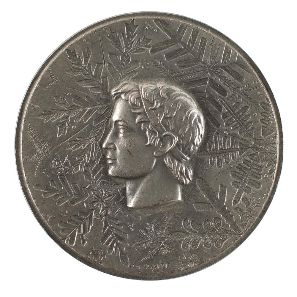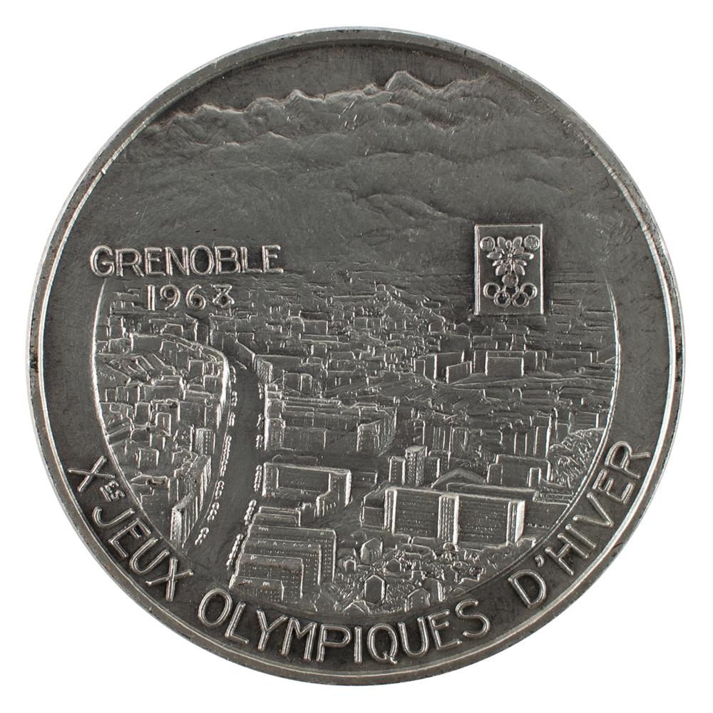 Striking participation medal issued for the Grenoble 1968 Winter Olympics. Silvered bronze, 68 mm, 158 gm, by J. M. Coeffin. The front depicts a Greek athlete wearing a headband superimposed against a background of snowflakes; the reverse bears the Grenoble Games emblem and a city view with the Belladonne mountain range in the background, with raised text along the bottom, “X Jeux Olympiques D’Hiver.” The edge stamped "1968, Bronze." A notably uncommon participation medal presented to dignitaries and officials.