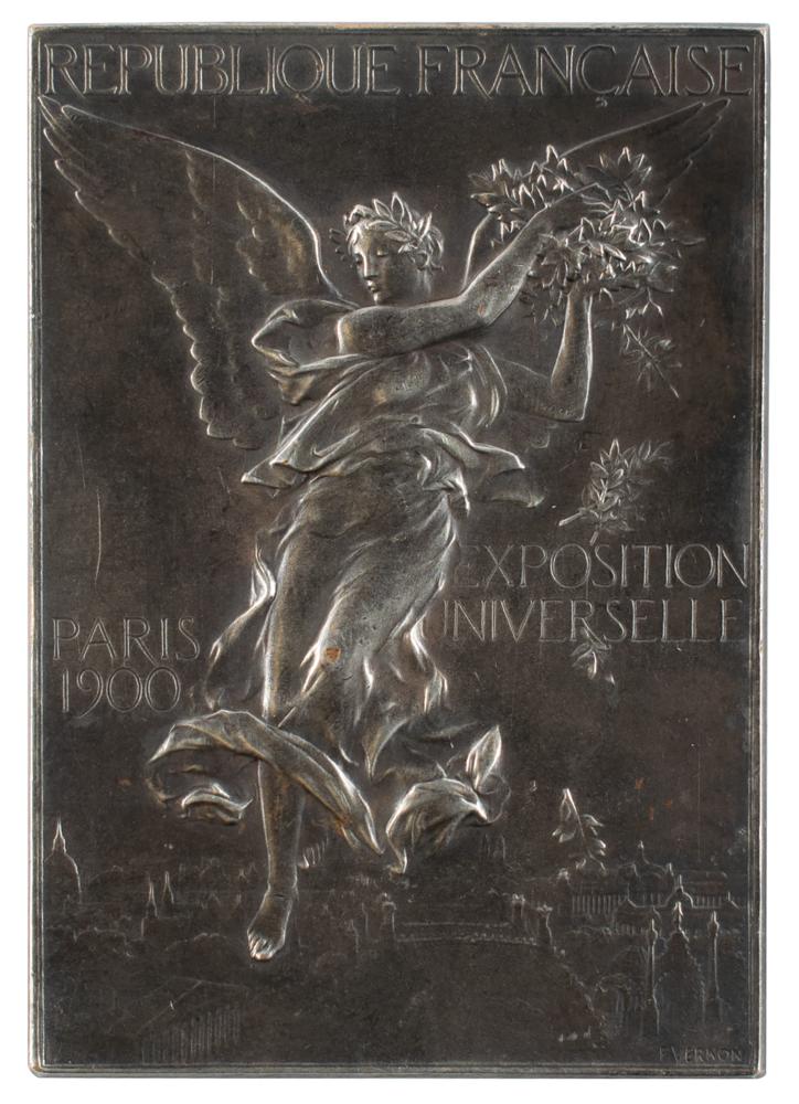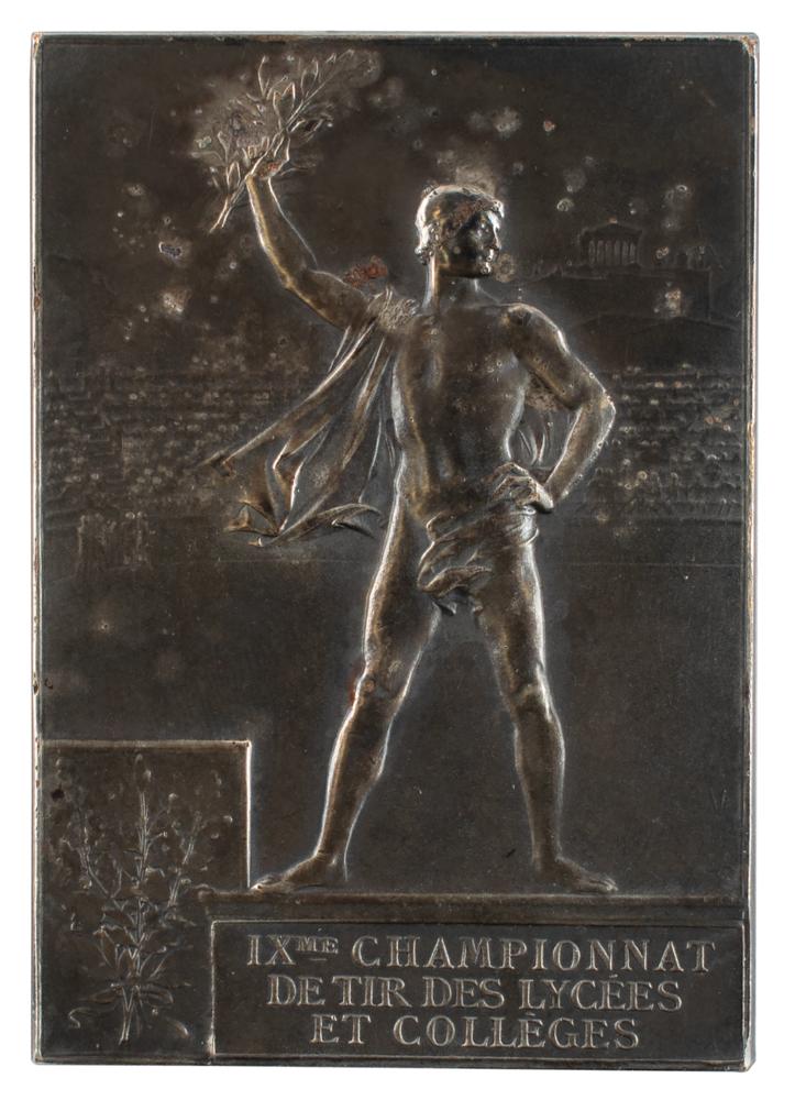 Winner’s medal issued for a high school and college shooting competition hosted alongside the Paris 1900 Olympics. Silvered bronze, 42 mm x 60 mm, 59 gm, by Frederic Vernon, Paris. The front, inscribed “Republique Francaise, Exposition Universelle, Paris 1900,” features a winged goddess scattering laurels over the grounds of the Exposition; the reverse identifies the sport as shooting, “IXme Championnat de Tir des Lycées et Collèges [9th High School and College Shooting Championship]” and depicts a victorious athlete upon a podium with a stadium and the Acropolis in the background. Stamped “Bronze” on an edge.